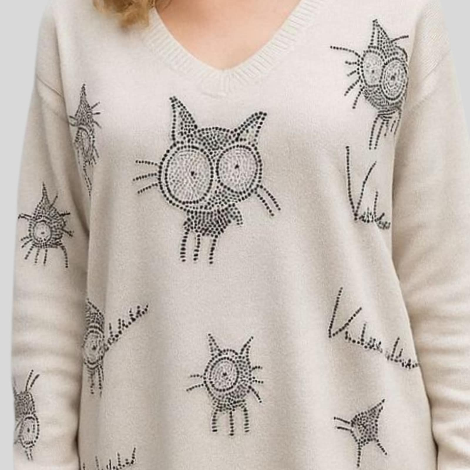 Pulover crem tricot cu strasuri argintii in forma de pisica