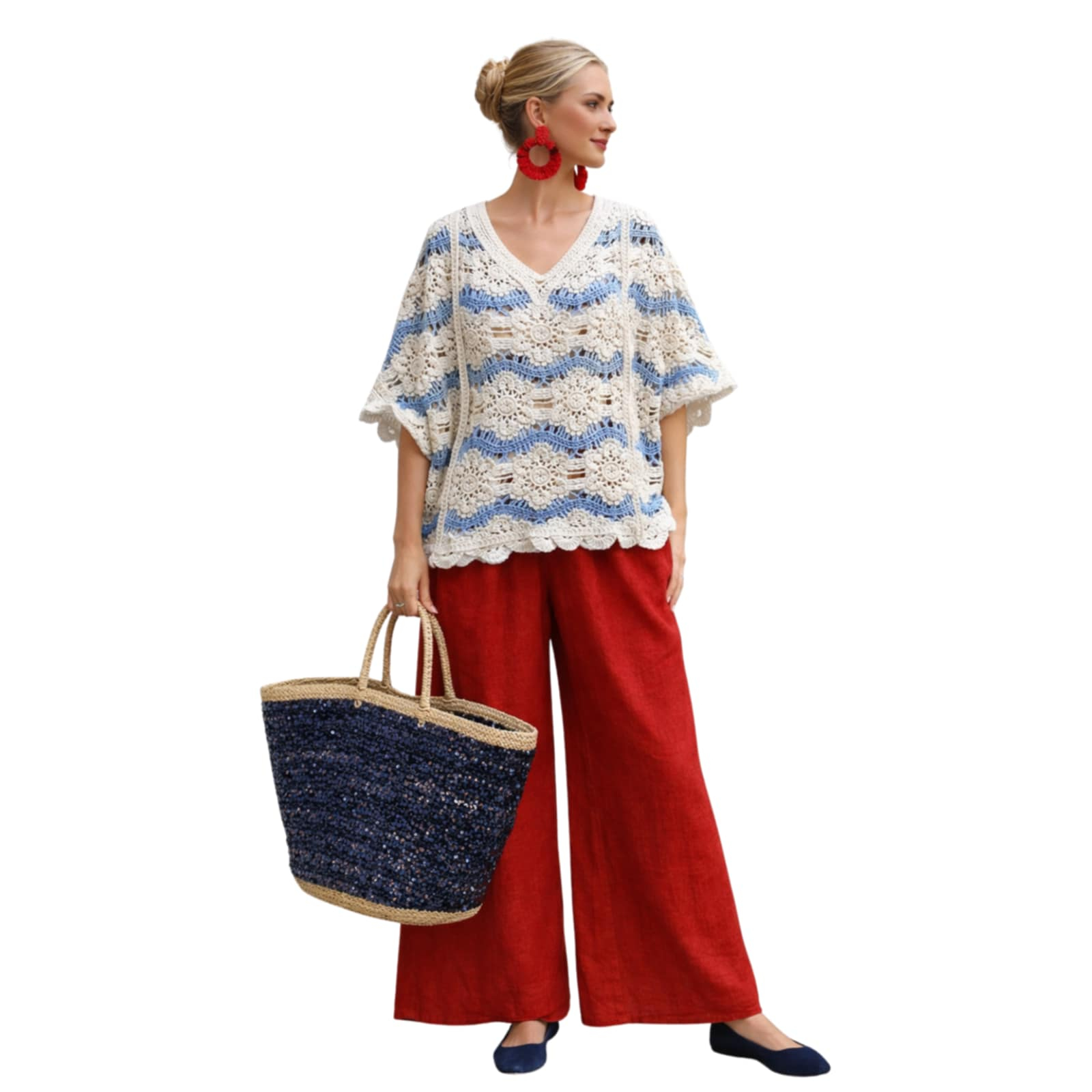 Impresioneaza prin detaliile atent lucrate si combinatia delicata de crem si bleumarin deschis Croiul lejer tip poncho cu maneci largi si linie fluida, ofera confort si libertate de miscare, fiind ideala atat pentru tinute casual elegante cat si pentru combinatii de vacante, sau evenimente de zi