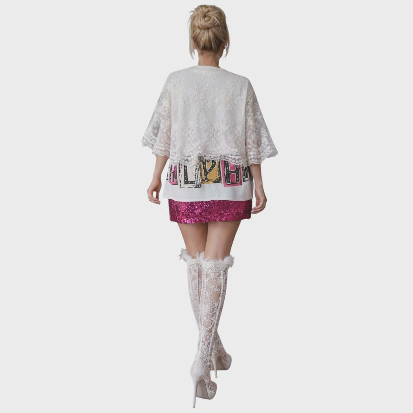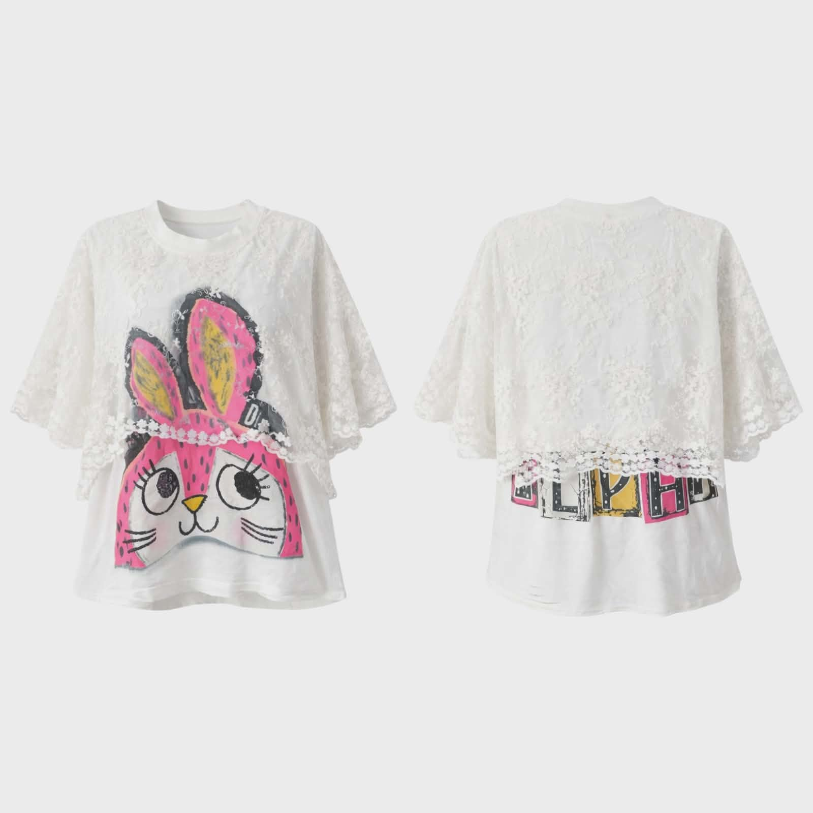 Bluza alba cu dantela alba tip pelerina cu imprimeu iepuras cu paiete