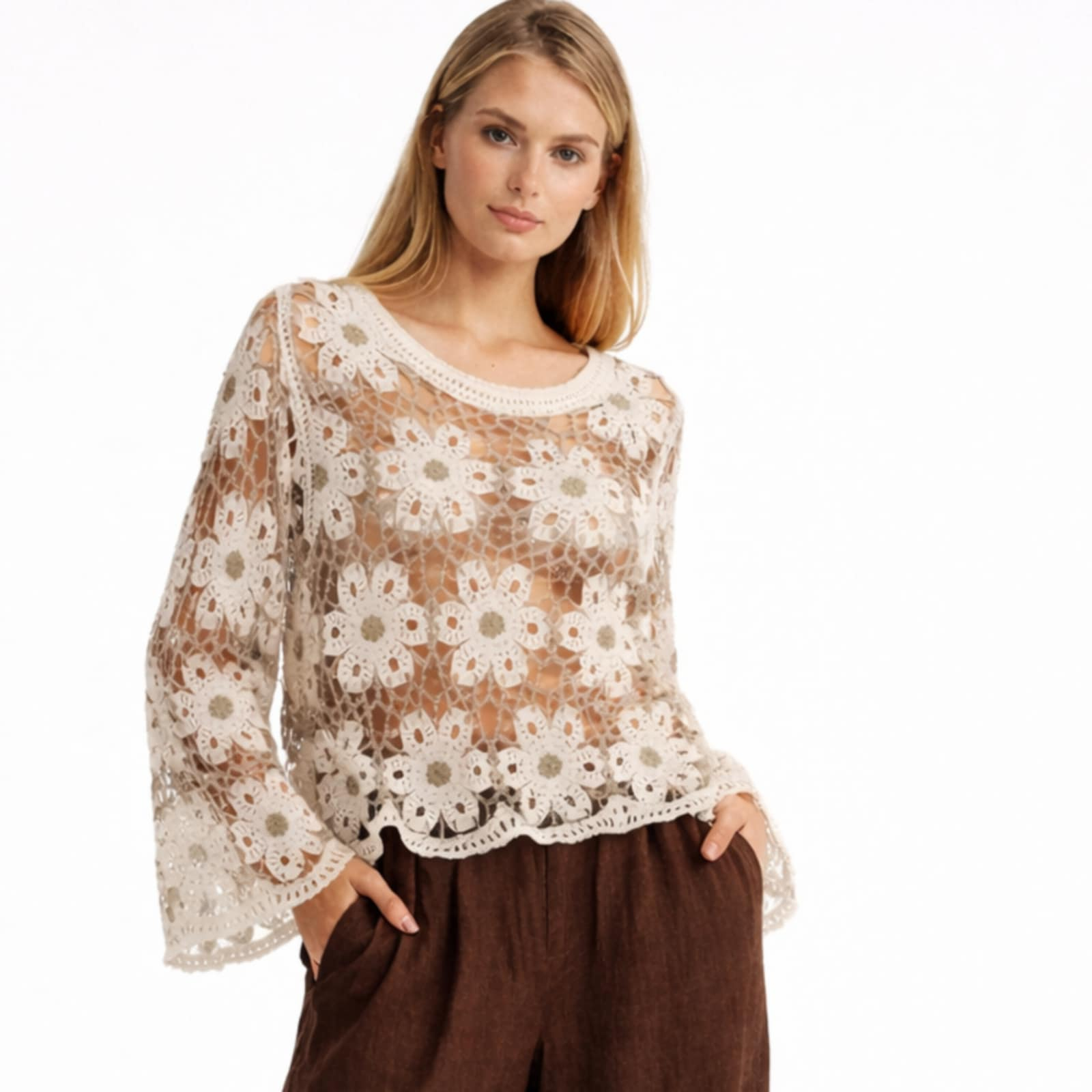 Bluza macrame cu flori aplicate este piesa statement care transforma instant orice tinuta, intr-o aparatie memorabila