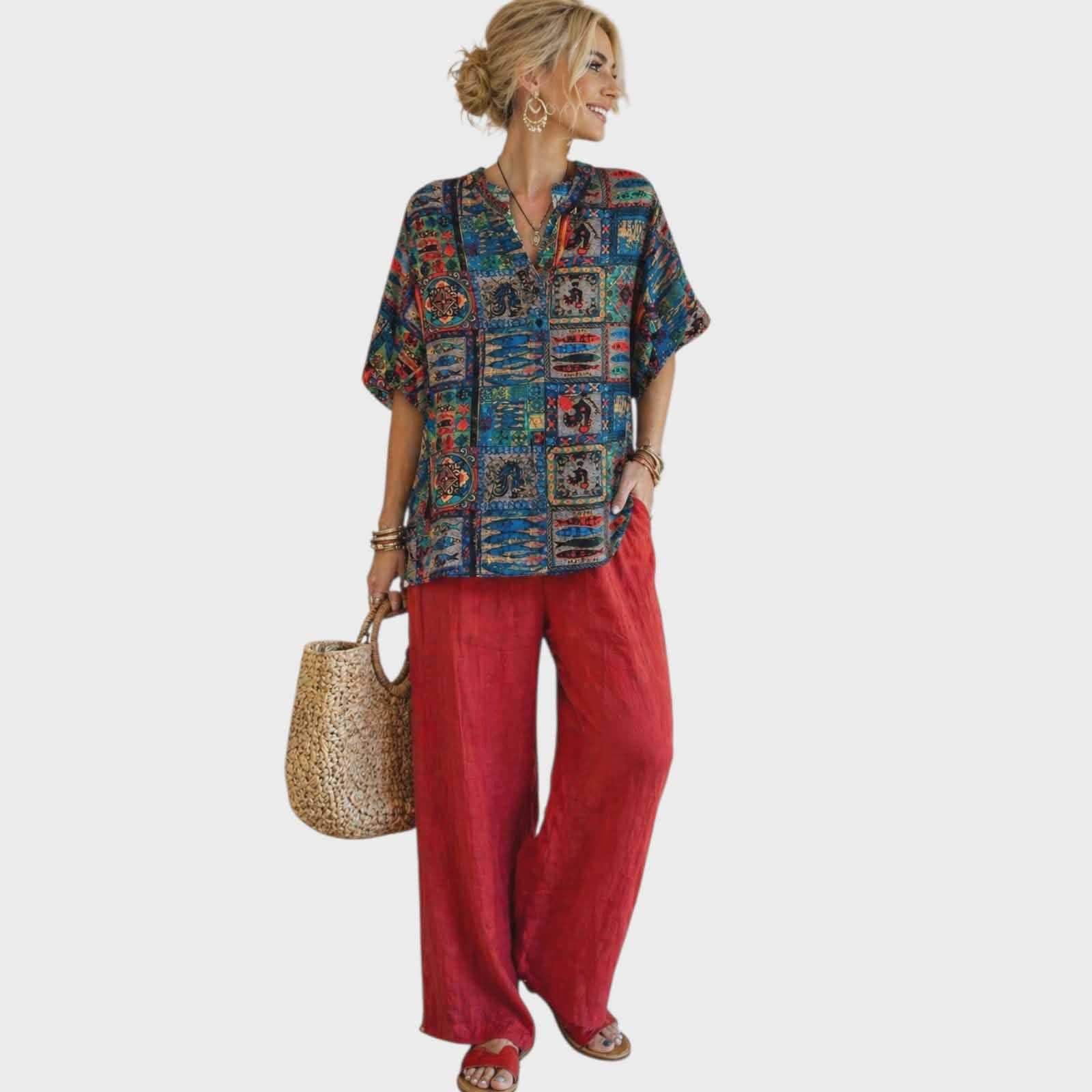 Croiul bluzei este larg cu imprimeu artistic multicolor si inspiratie bohoCompozitie: bumbac 65% vascoza 35%