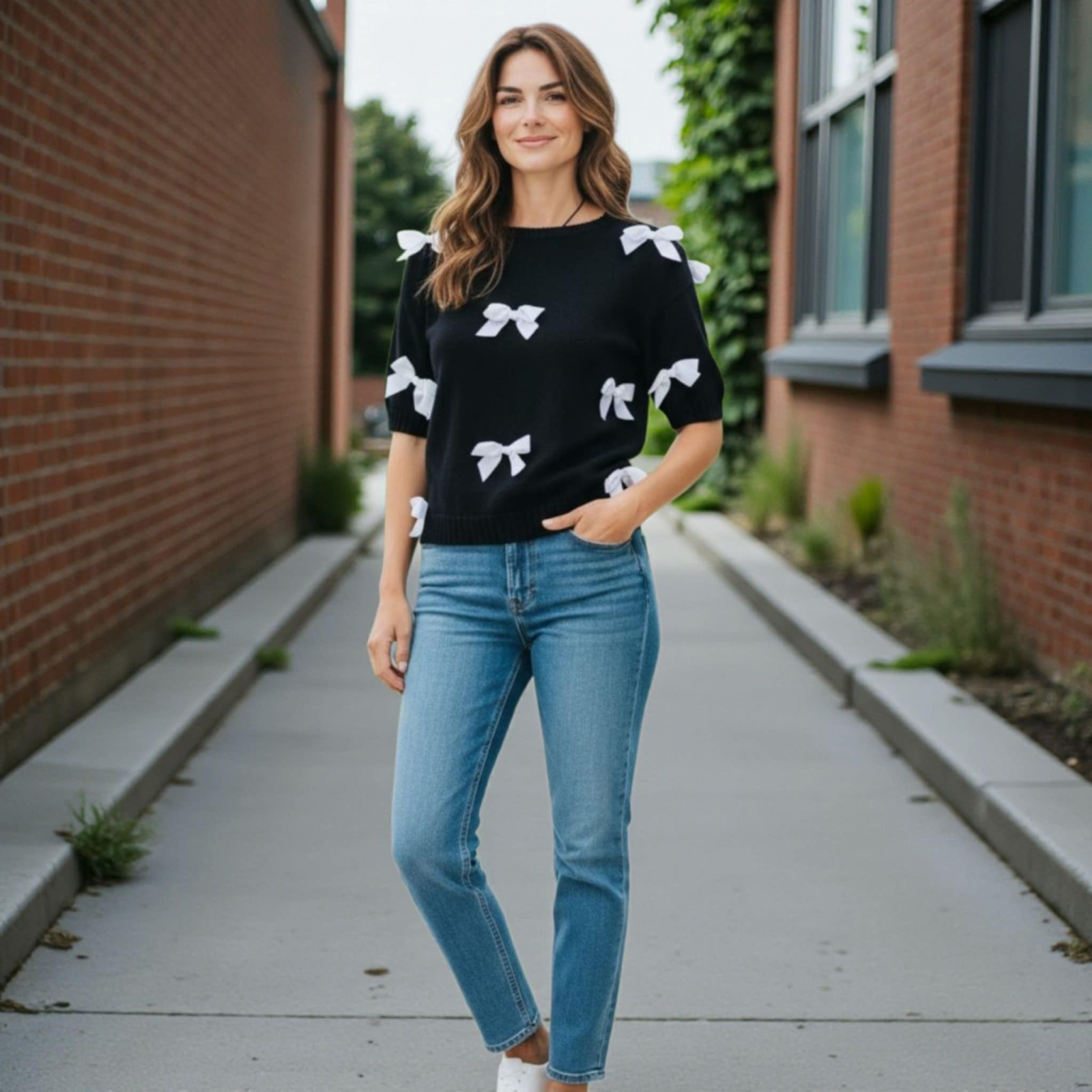 Bluza pentru sezonul rece cu fundite albe pe fond negru