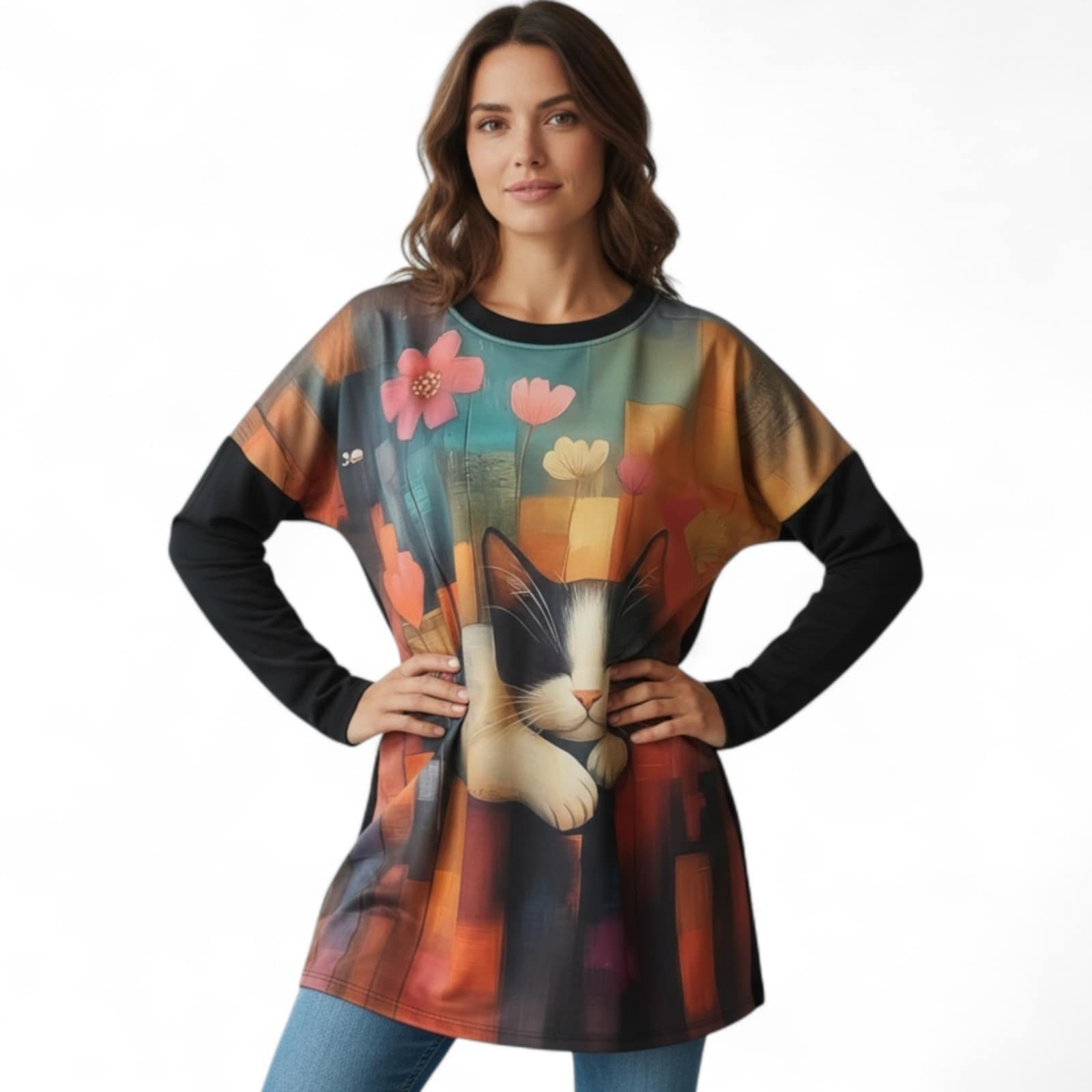 Tunica pentru colanti cu imprimeu artistic pisica si flori