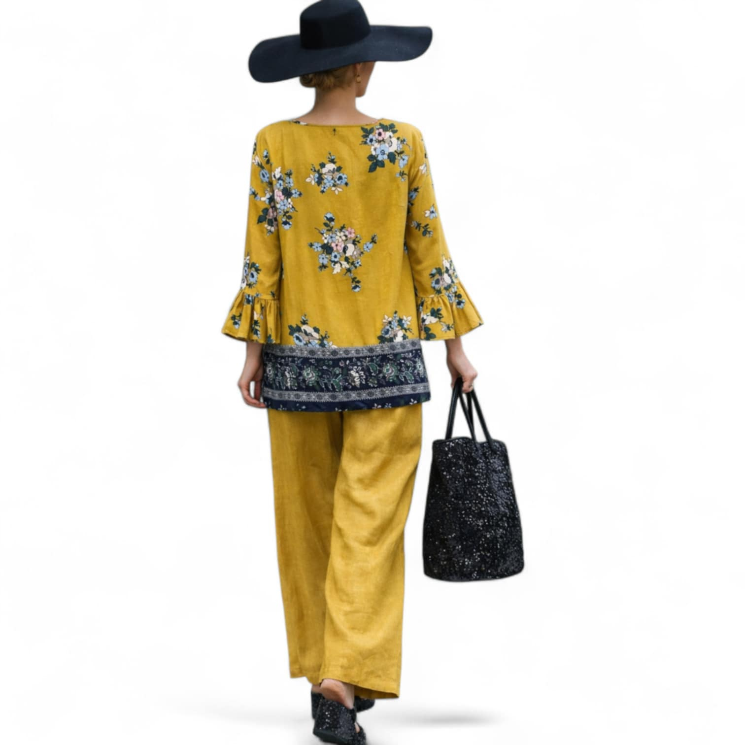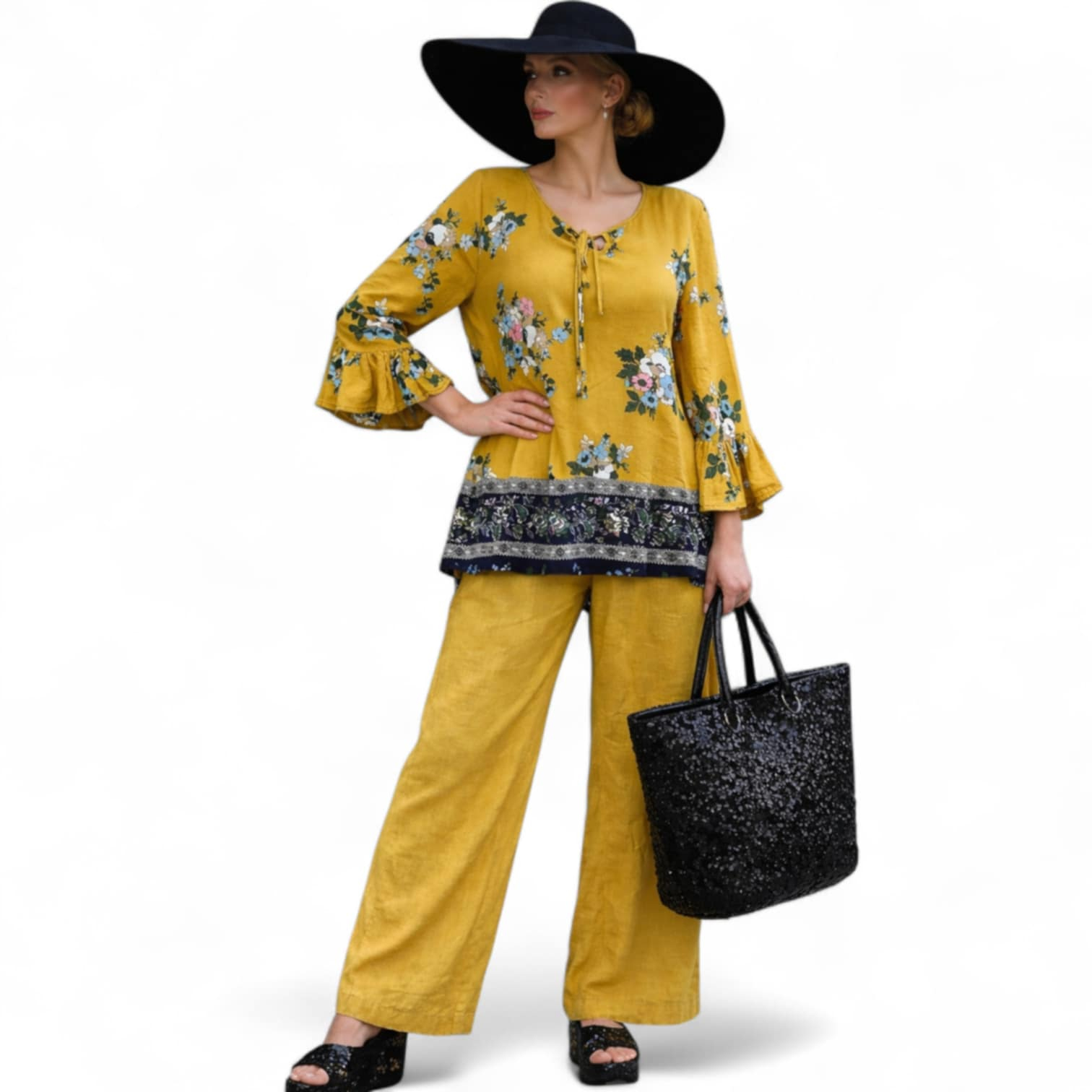 Bluza din vascoza cu imprimeu flori pe fond galben mustar