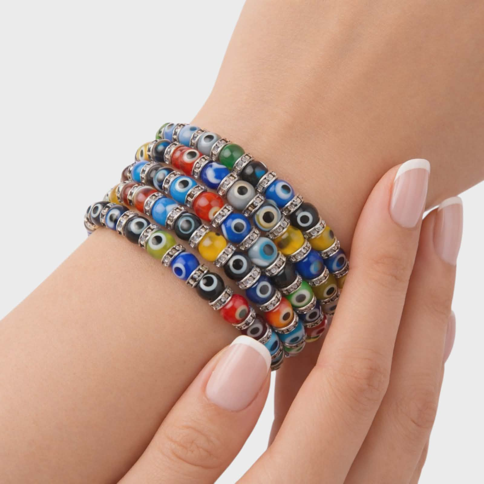Este realizata din margele rotunde colorate, decorate cu simbolul ochiului protector, bratara combina armonios nuante vibrate de rosu, galben, verde si