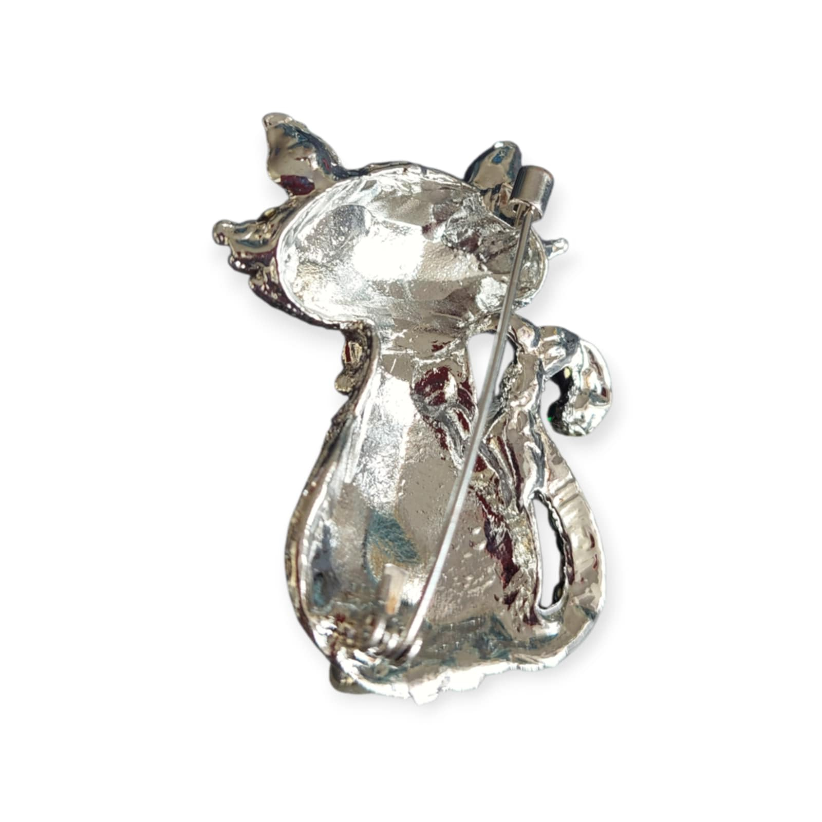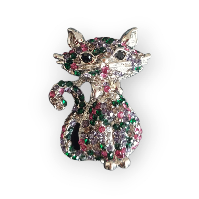 Brosa in forma de pisica din metal argintiu inoxidabil cu pietre colorate