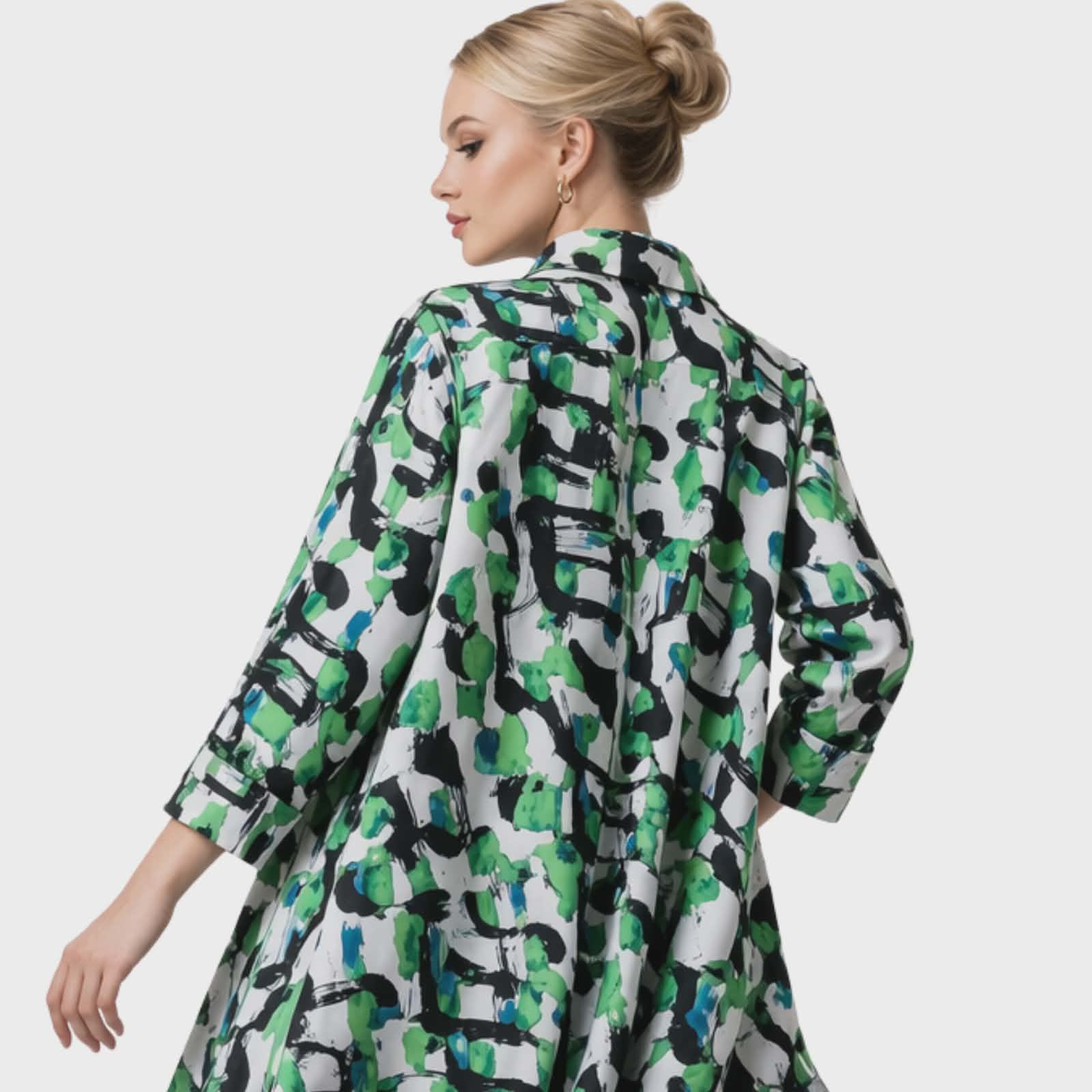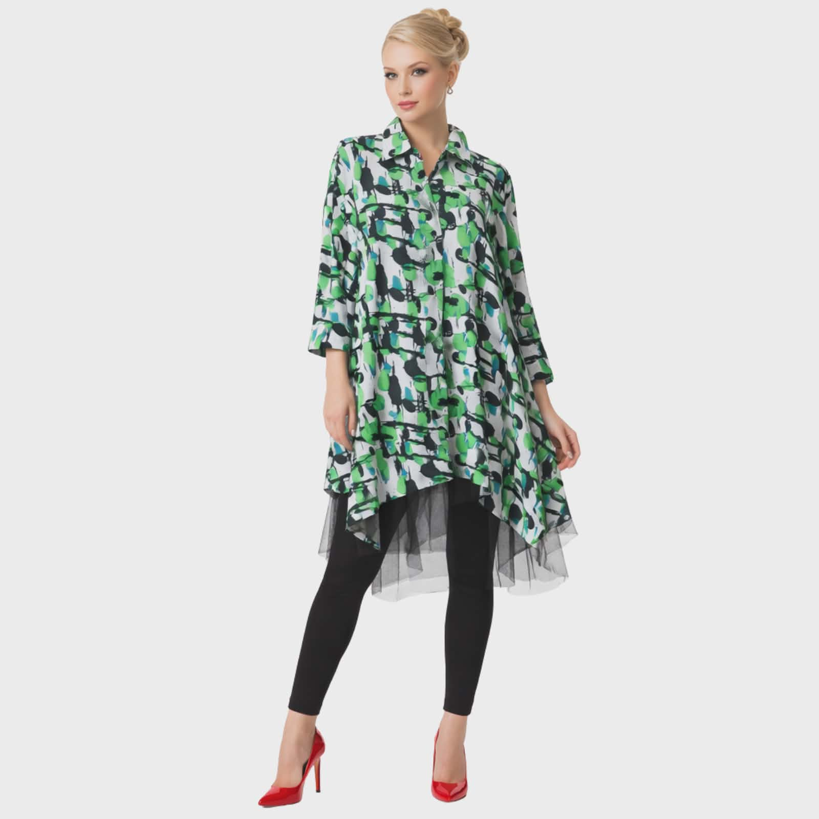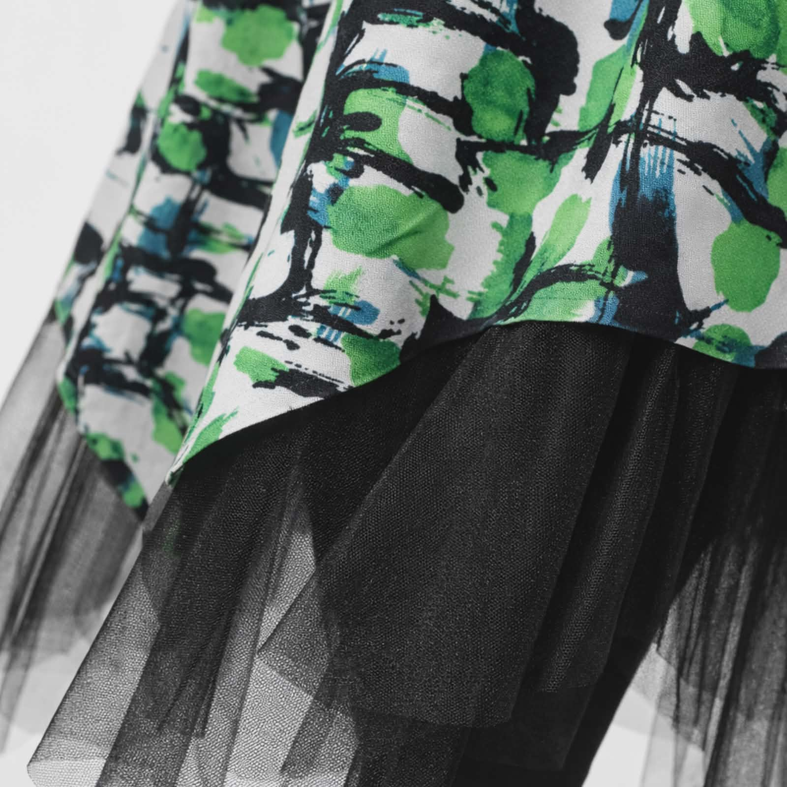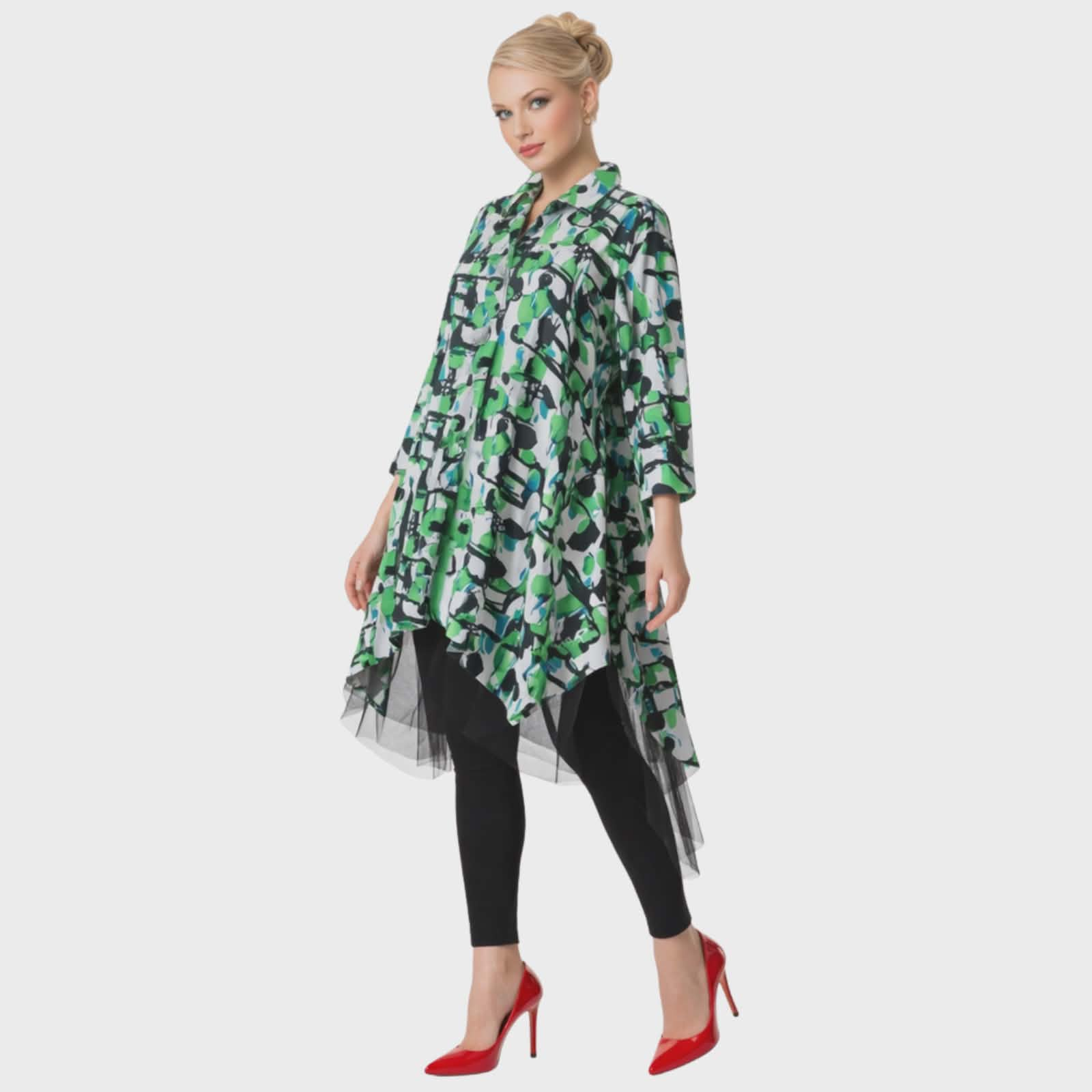 Camasa asimetrica impresioneaza prin croiul amplu, fluid si printul artistic in nuante de verde negru si alb, usor de integrat in outfituri moderne