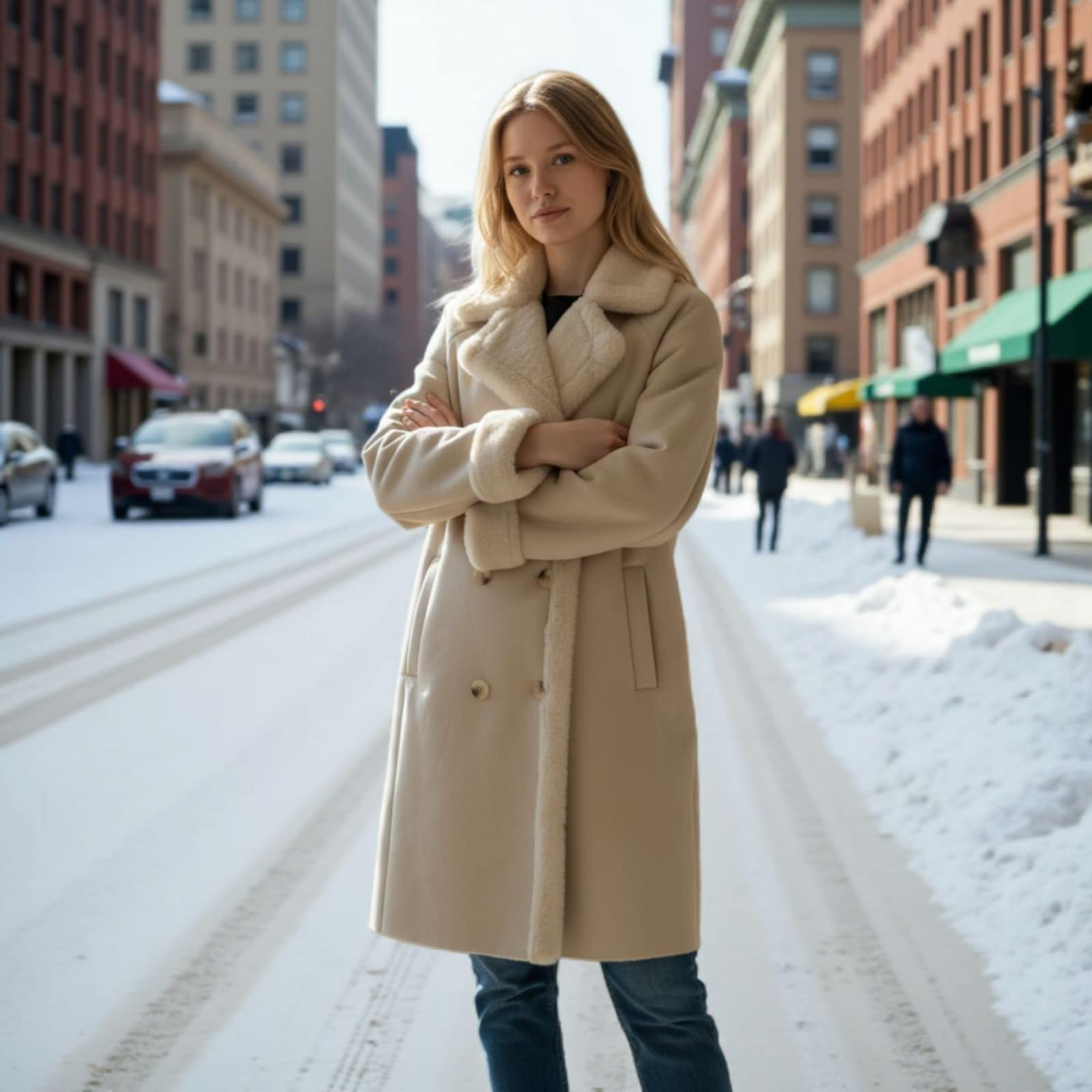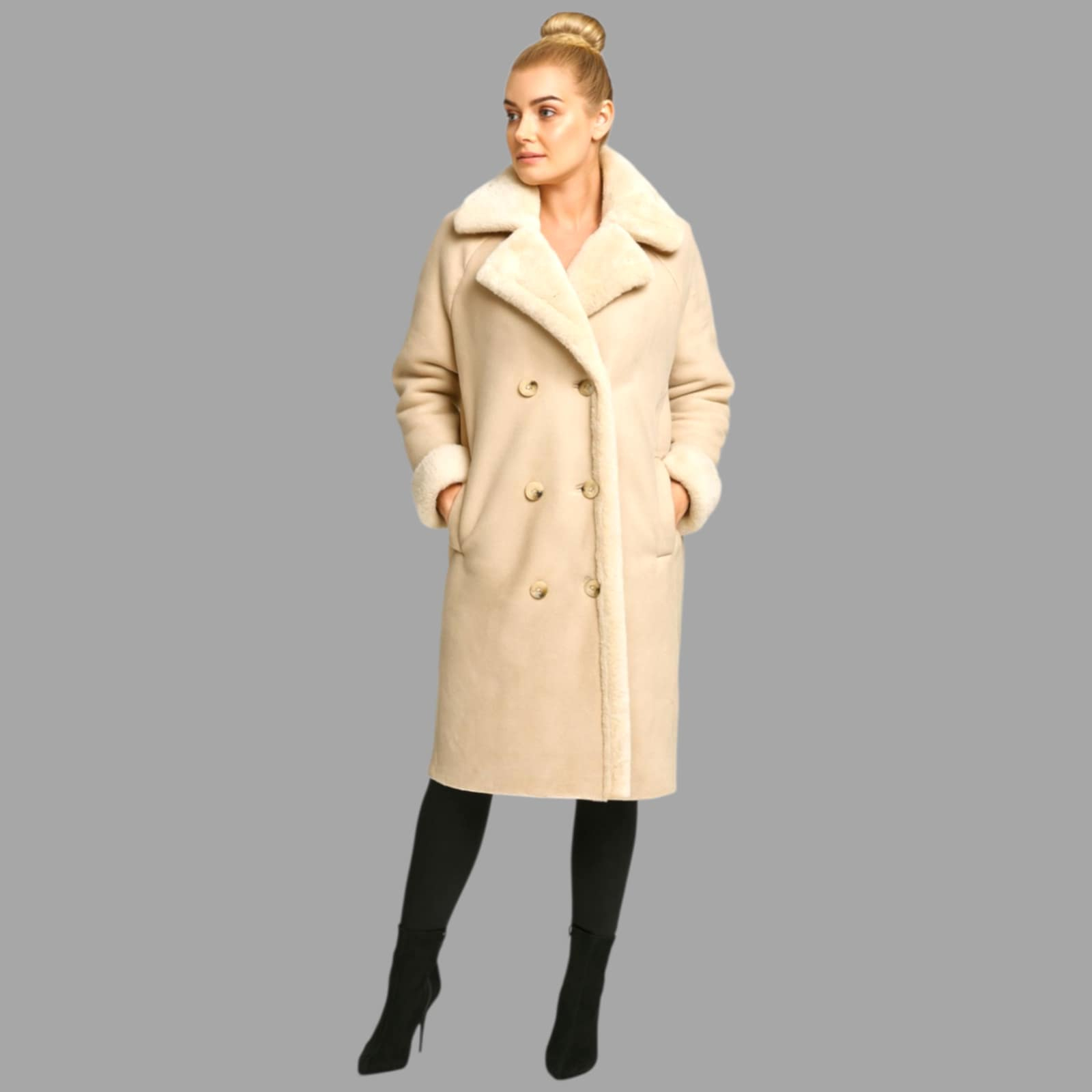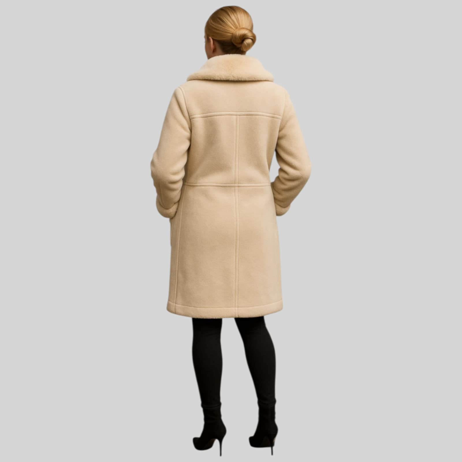 Cojoc crem pufos din blana ecologica cu buzunare laterale pentru iarna