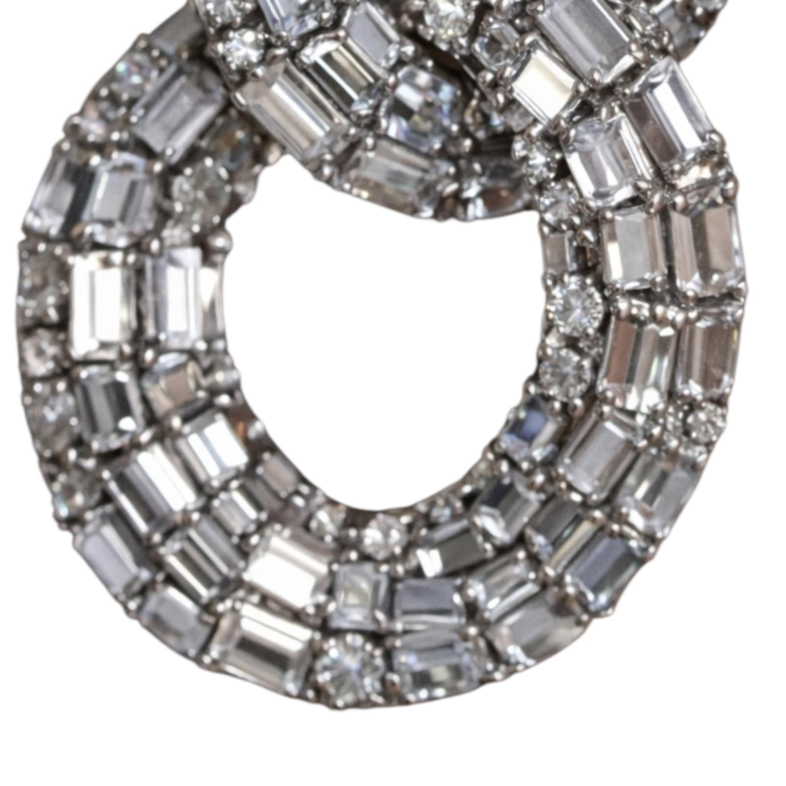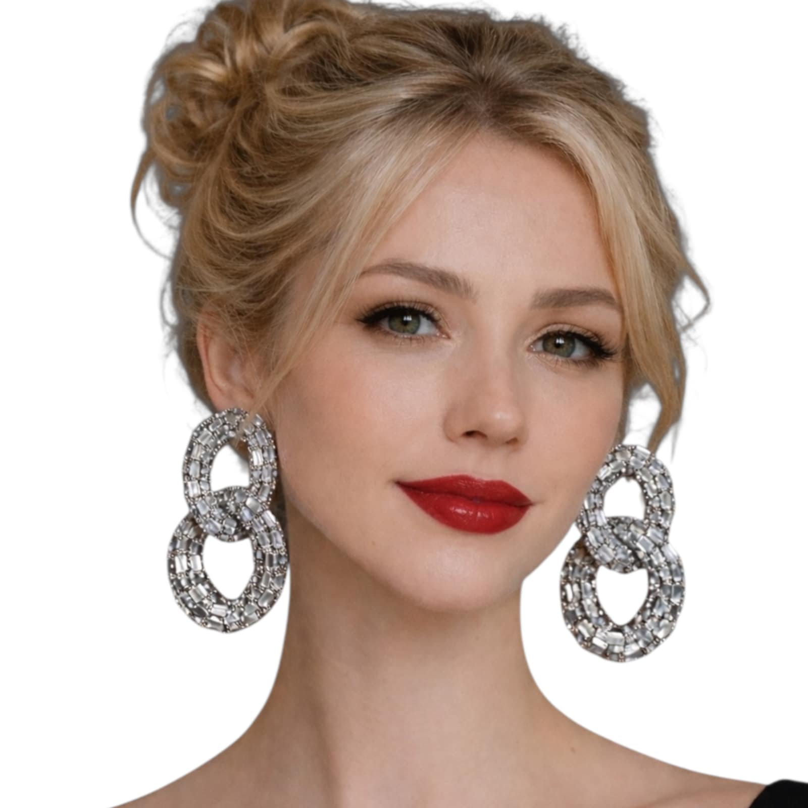 Cercei eleganti supradimensionati argintii cu cristale si model cerc dublu