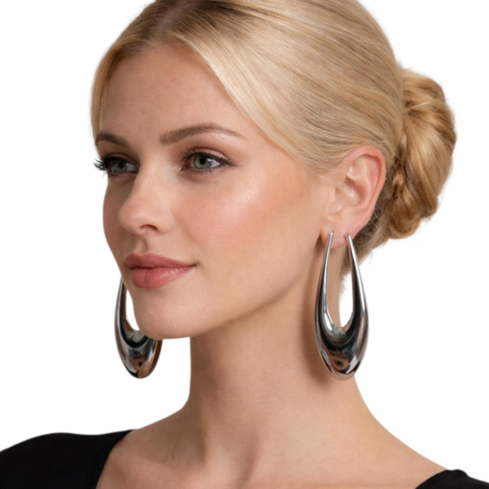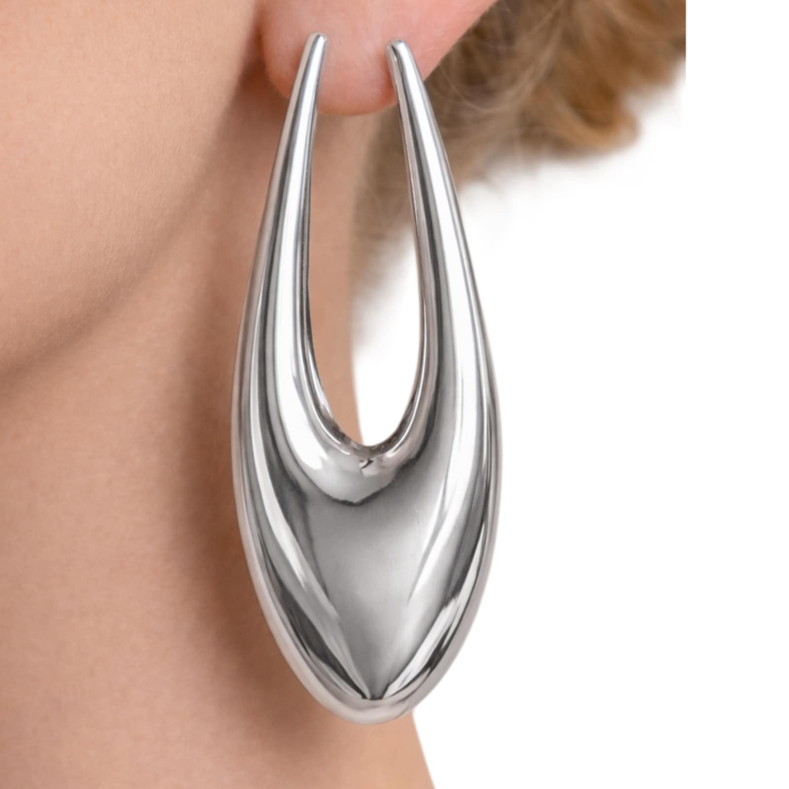 Cercei argintii statement, cu design modern picatura, realizati din metal cu finisaj lucios oglinda