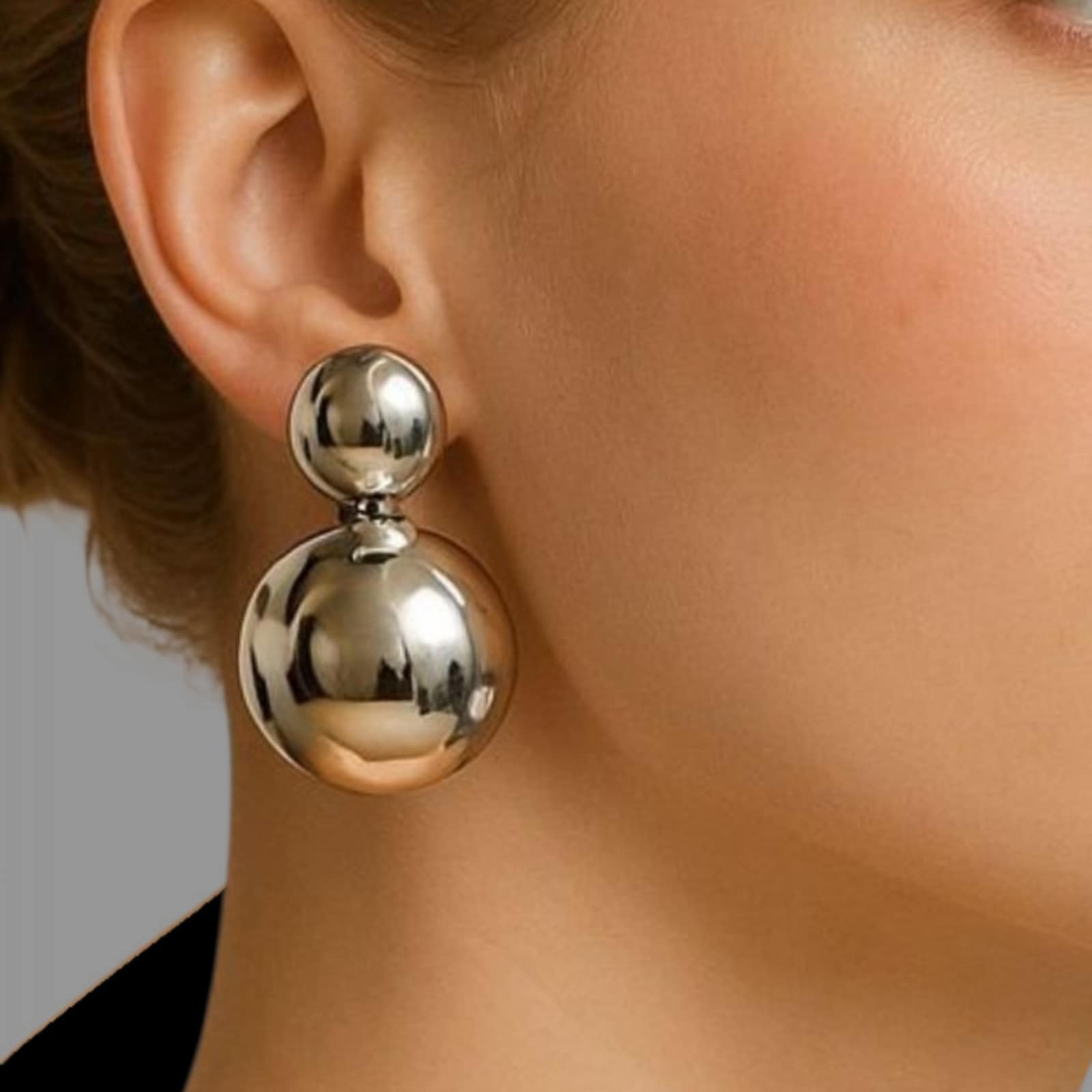 Cercei cu doua sfere rotunde argintii si lucioase statement