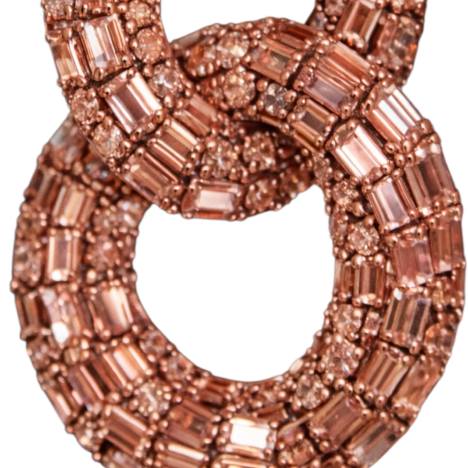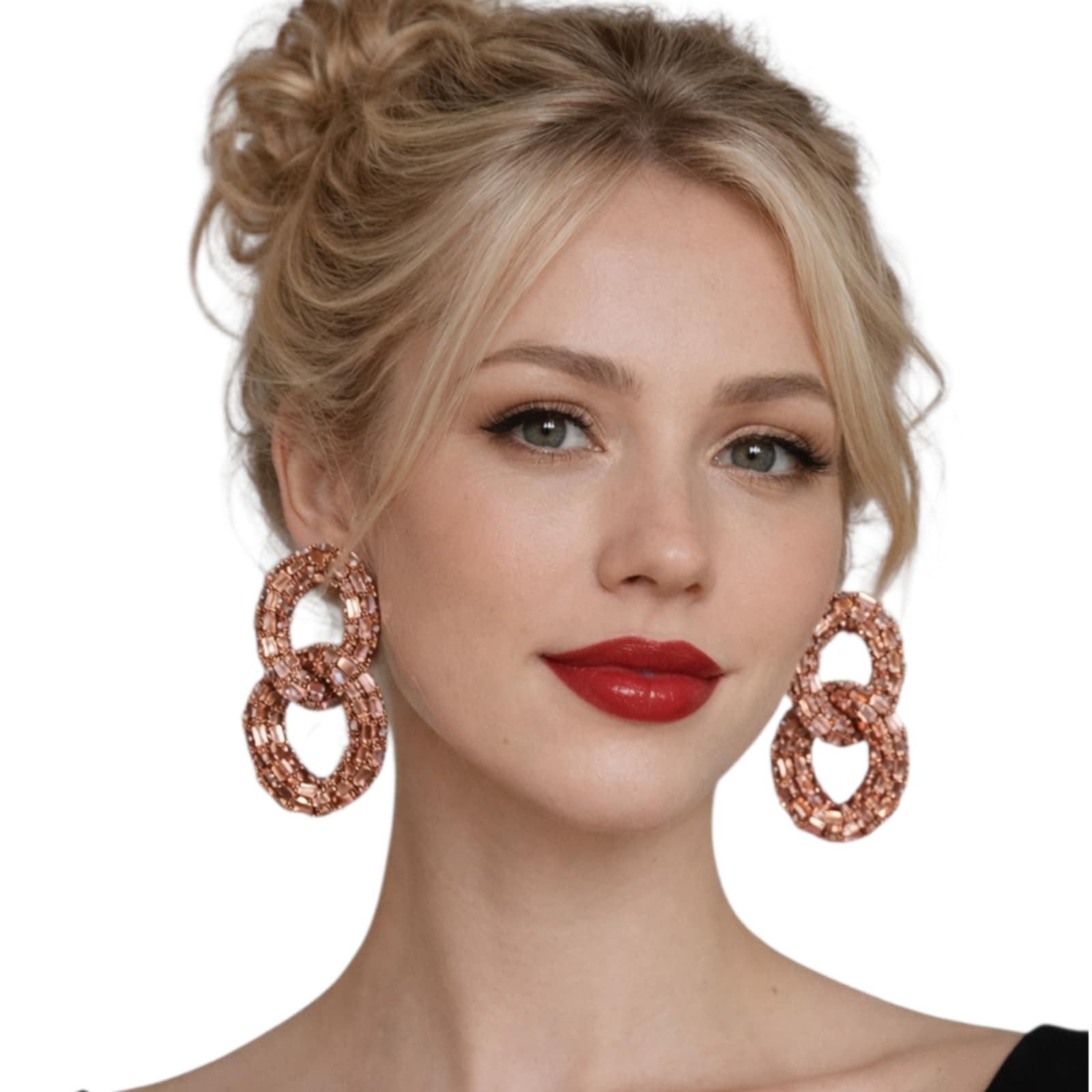 Cercei statement roz cu design modern din doua cercuri interconectate, decorati cu cristale fatetate stralucitoare