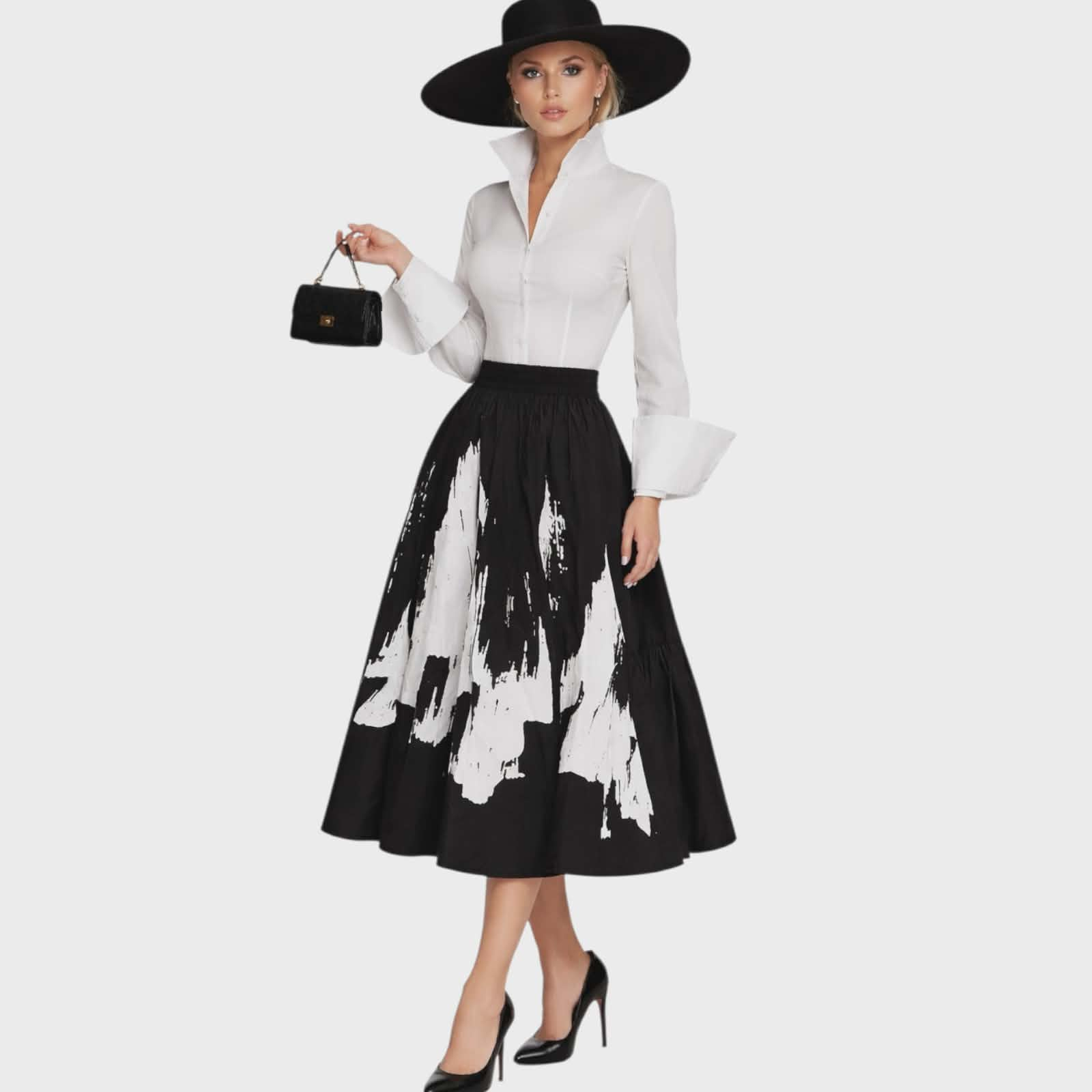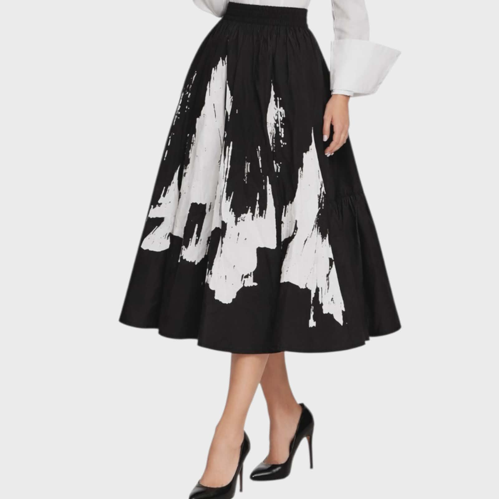 Imprimeul abstract alb pe fundal negru creeaza un contrast modern si sofisticat transformand fusta intr-o piesa usor de remarcat in orice garderoba