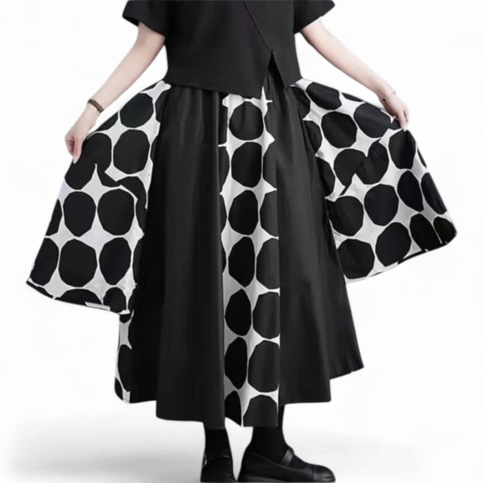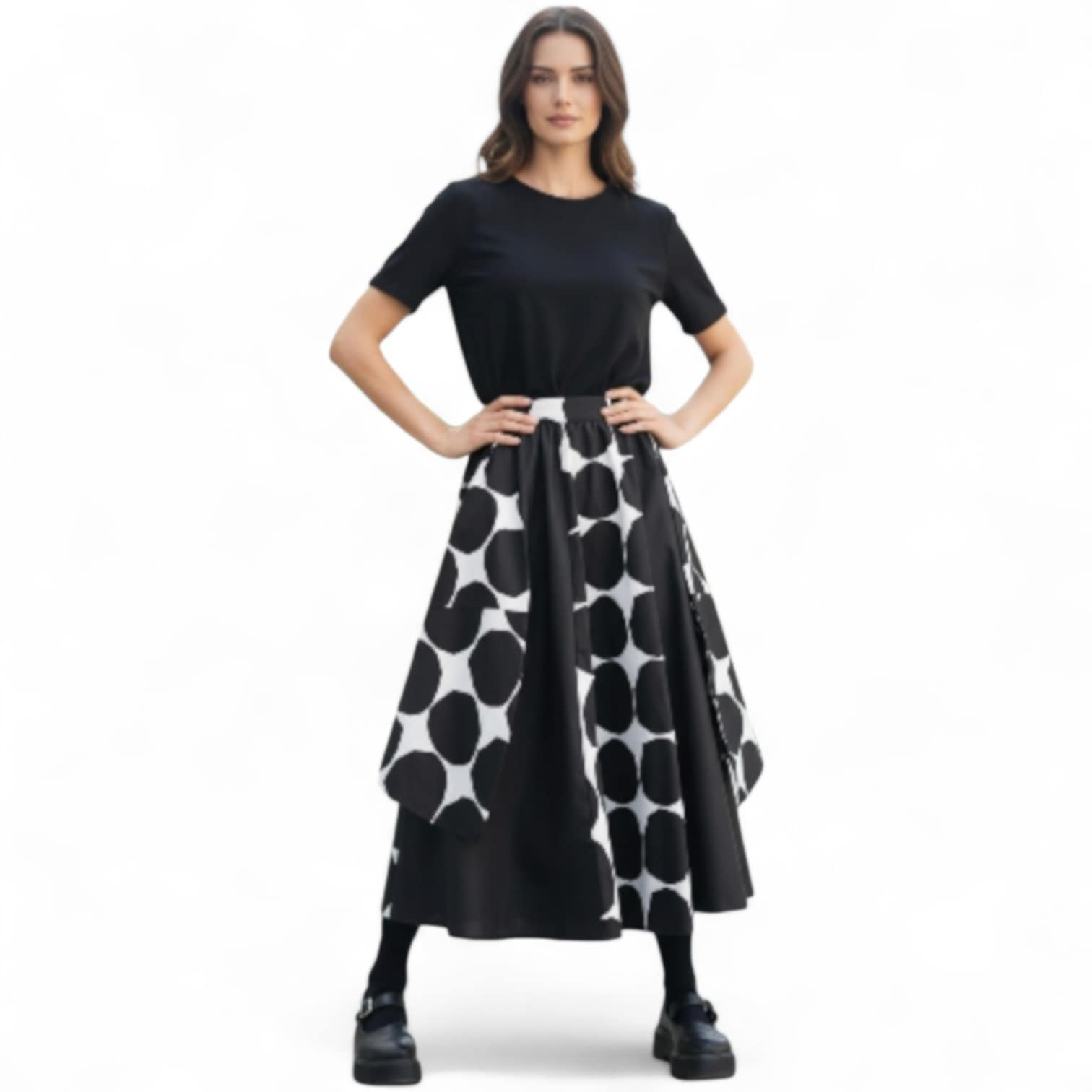 Fusta statement cu design modern, realizat intr-un contrast elegant alb-negru perfecta pentru tinute de zi cu un aer artistic sau aparitii urbane sofisticate