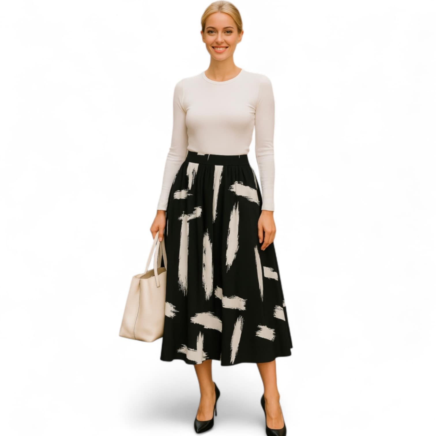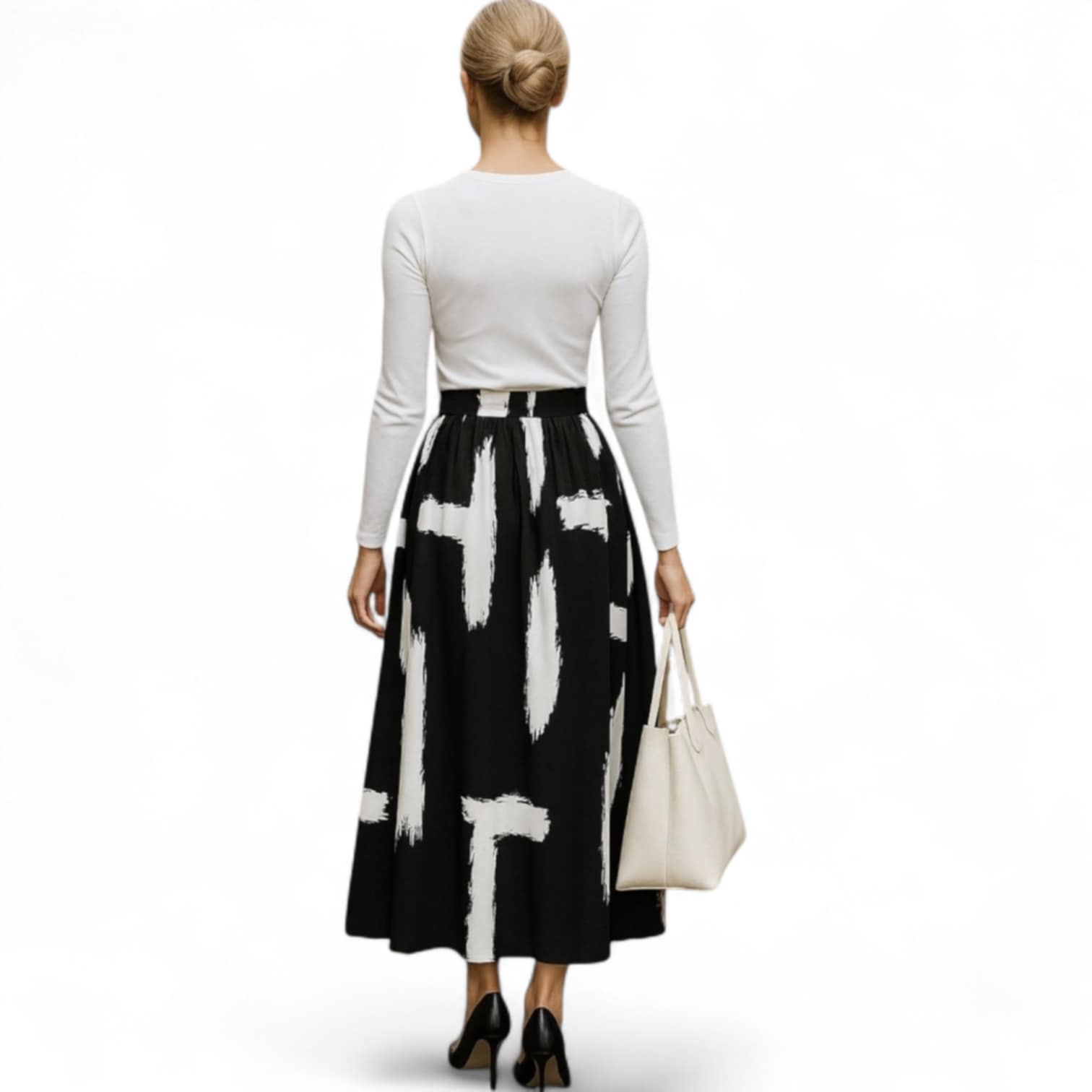 Fusta lunga neagra cu imprimeu abstract alb tip pensula