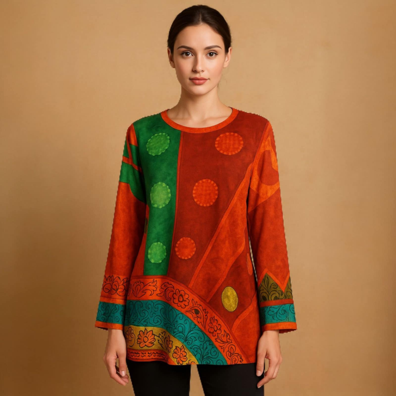 Bluza are nuante calde de rosu, portocaliu, verde, si albastra realizata din material fin si lejer, ideal pentru look confortabil si expresiv