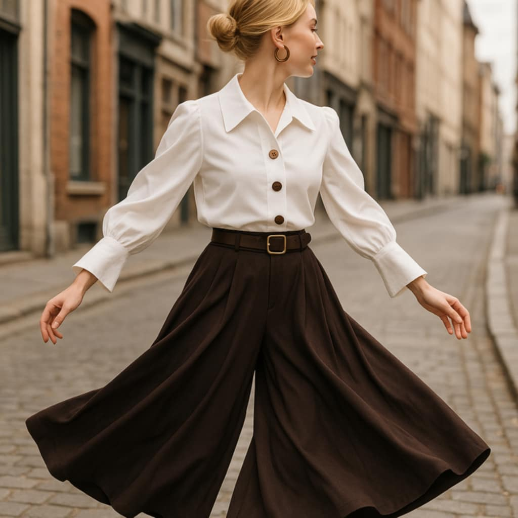 Fusta pantalon ampla din reiat fin maro cu buzunare laterale si curea inclusa