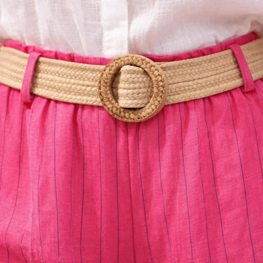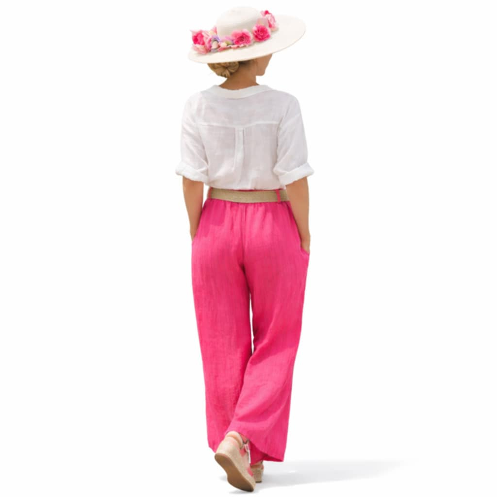 Pantaloni din in ciclam cu buzunare laterale si curea