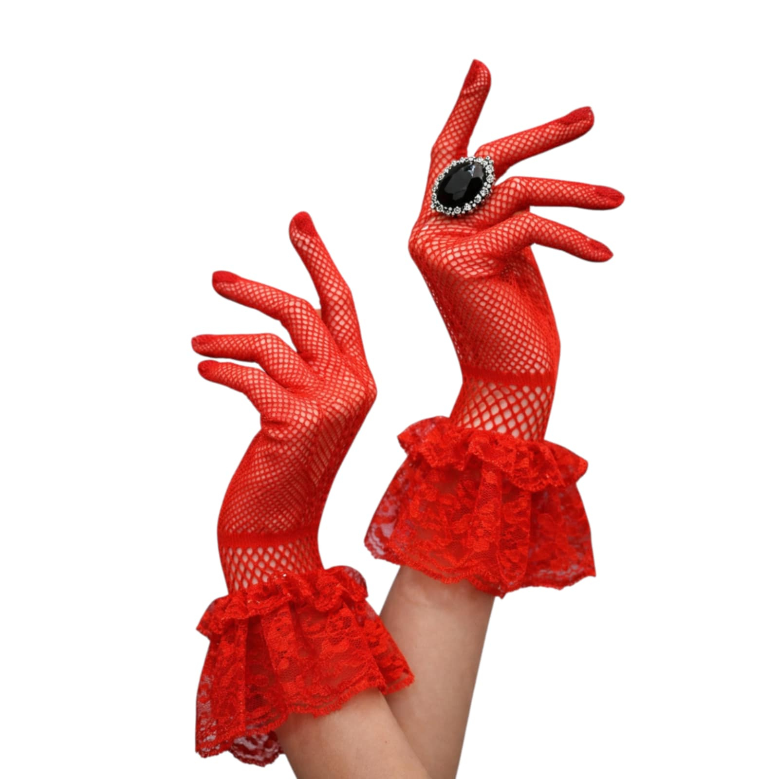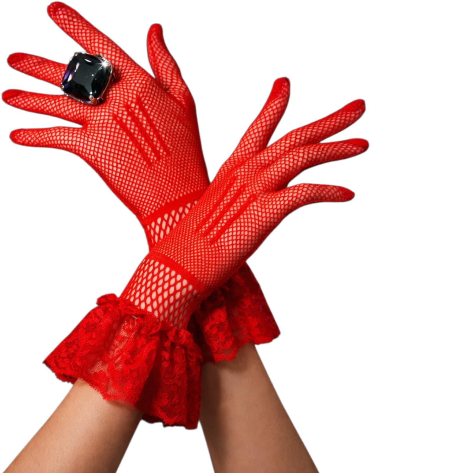 Manusi din plasa  rosie cu dantela la incheietura mainii