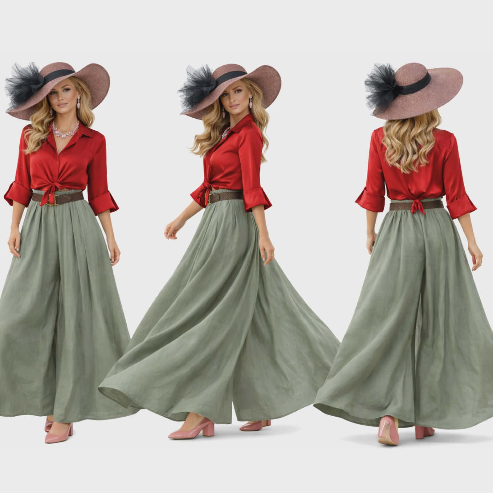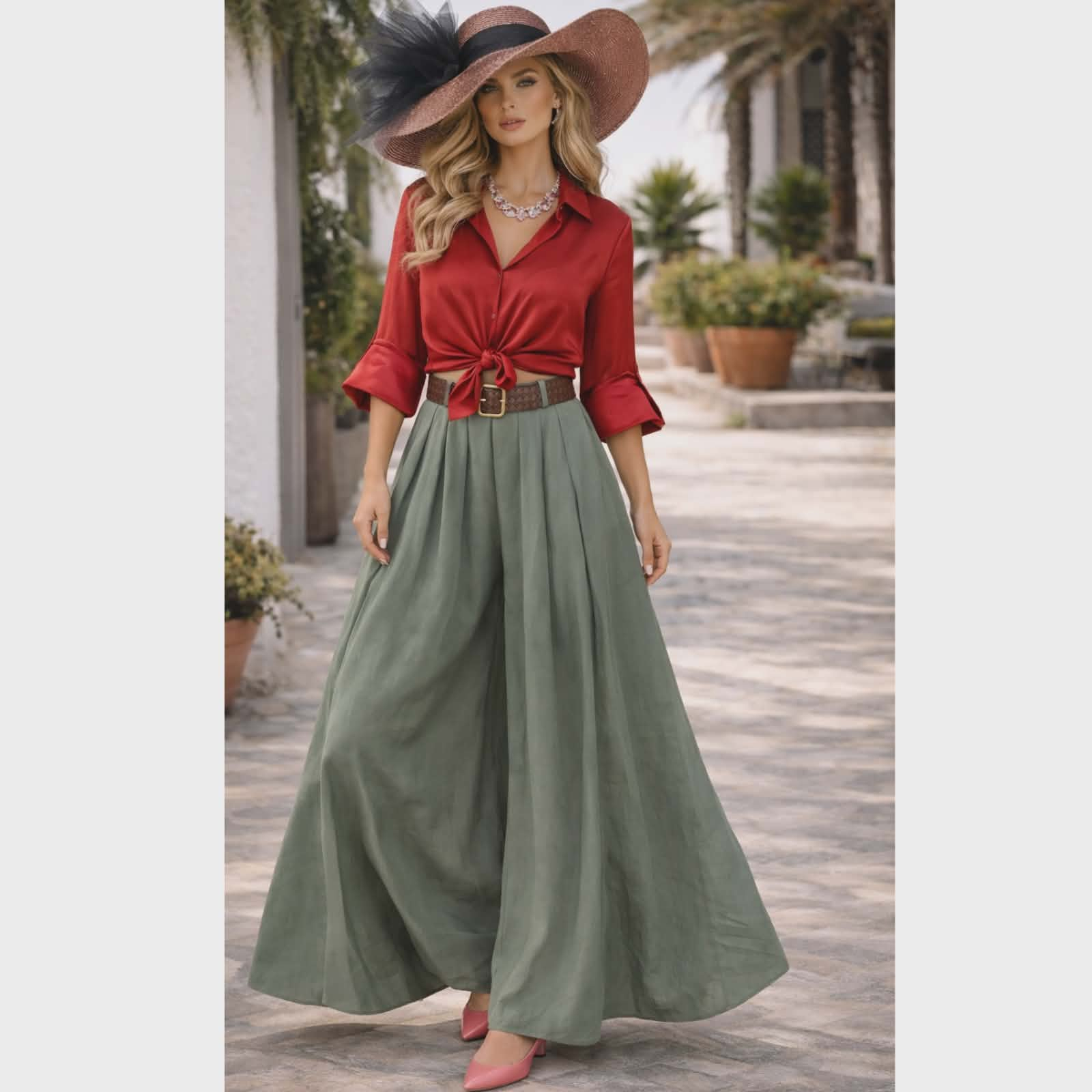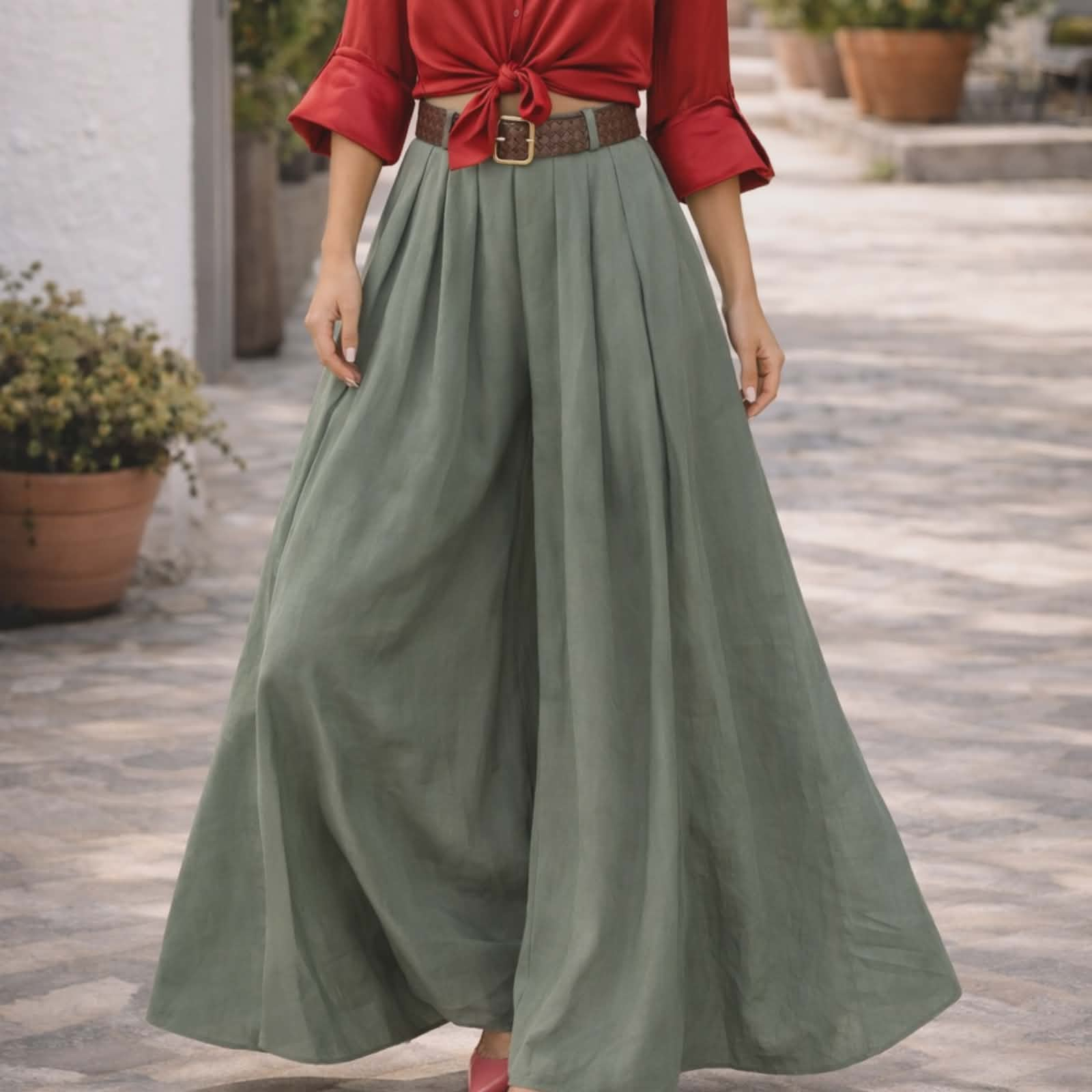 Fusta pantalon intr-o nuanta rafinata de verde kaki pal este alegerea perfecta pentru un look modern lejer si extrem de versatil