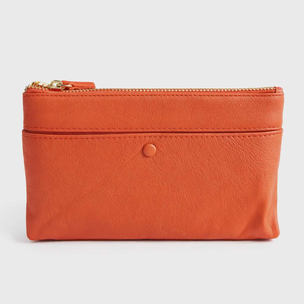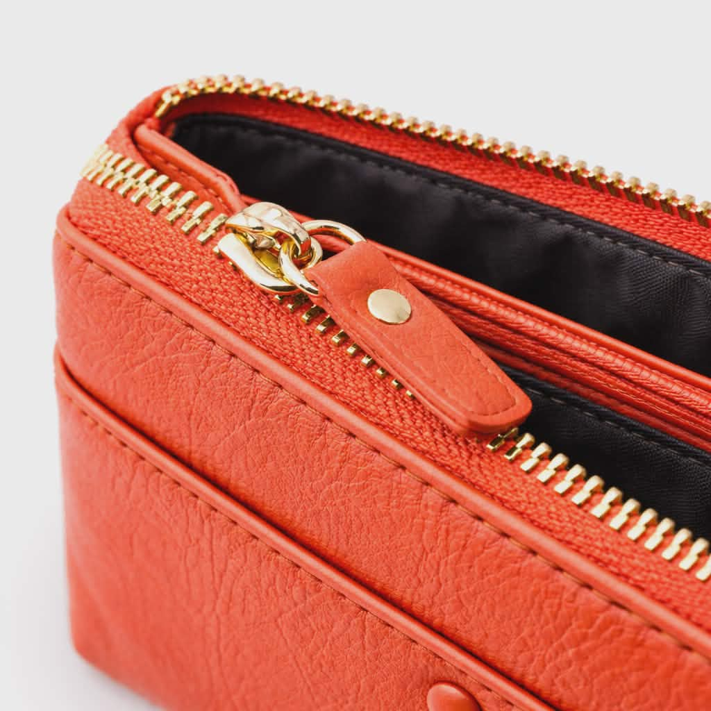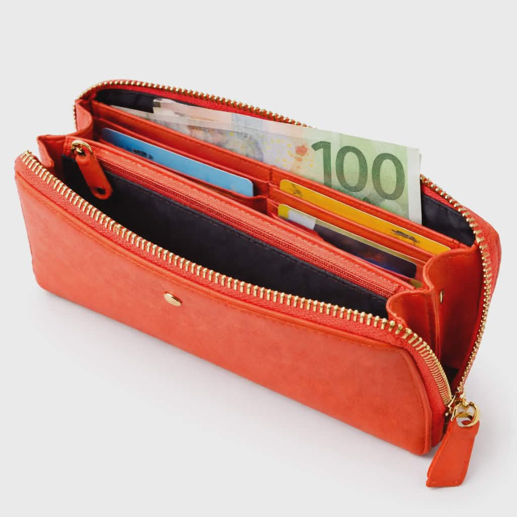 Are un compartiment pe partea din fata pe toata suprafata portofelului si un buzunar pe partea din spate care se inchide cu fermoar