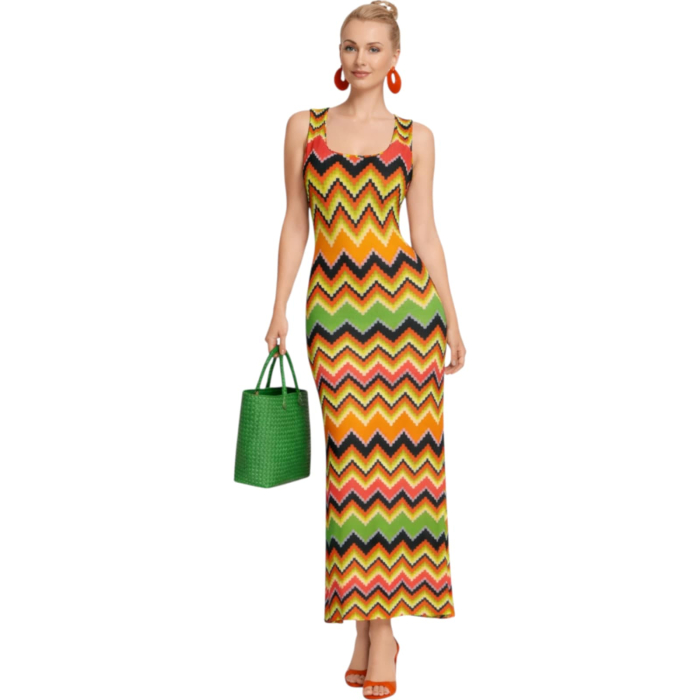 Rochie lunga din lycra cu model colorat in zigzag si croi drept
