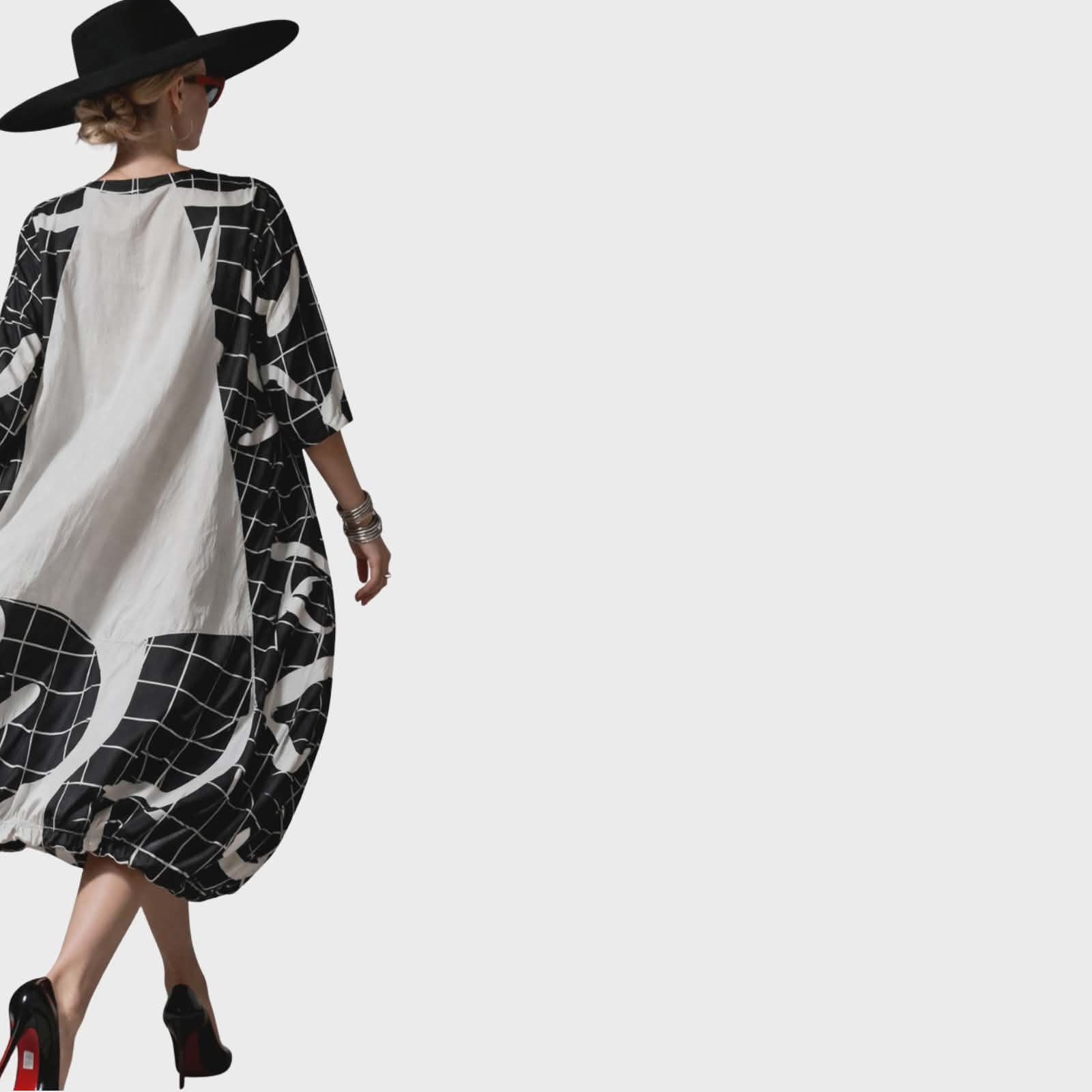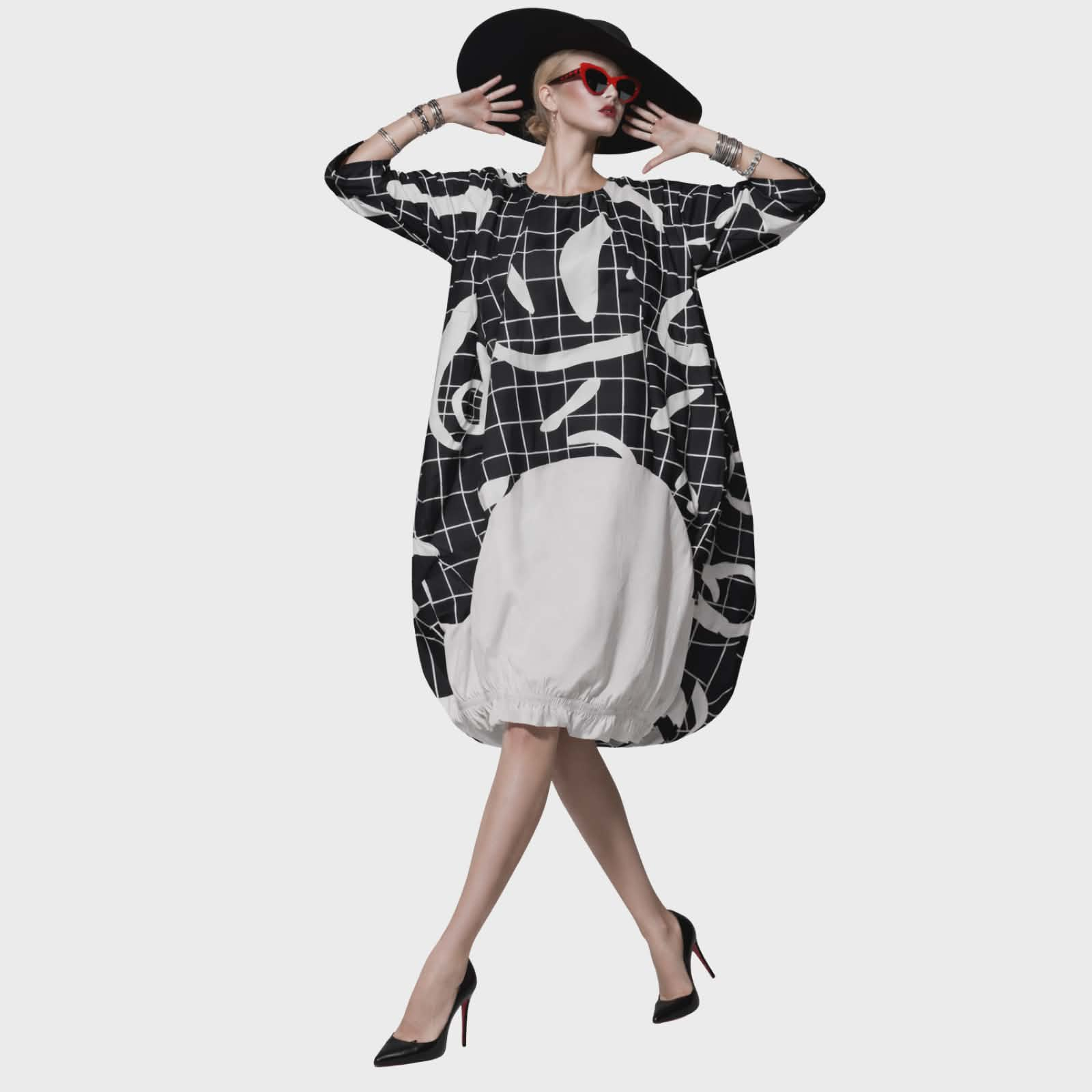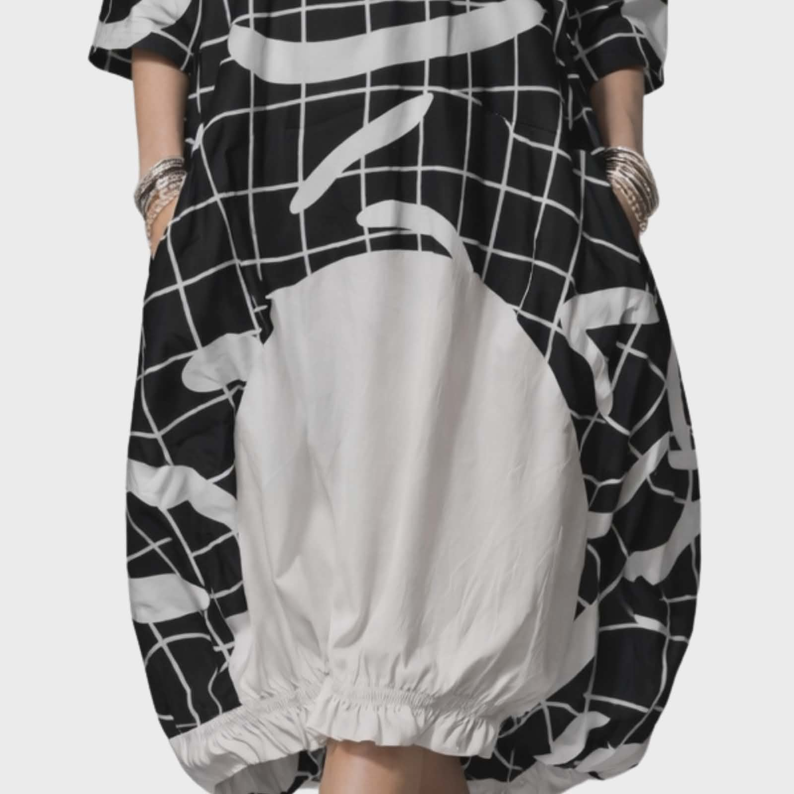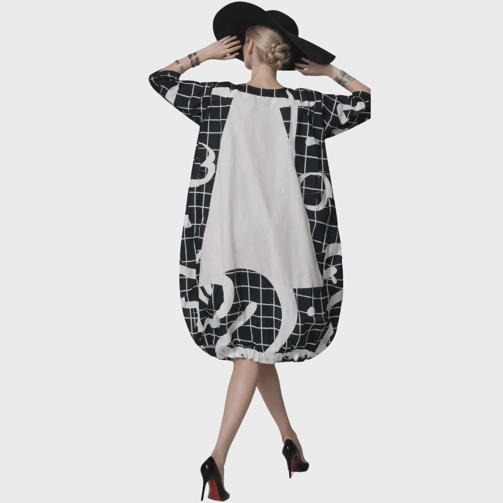 Rochie din bumbac si imprimeu alb si negru cu croi gogosar