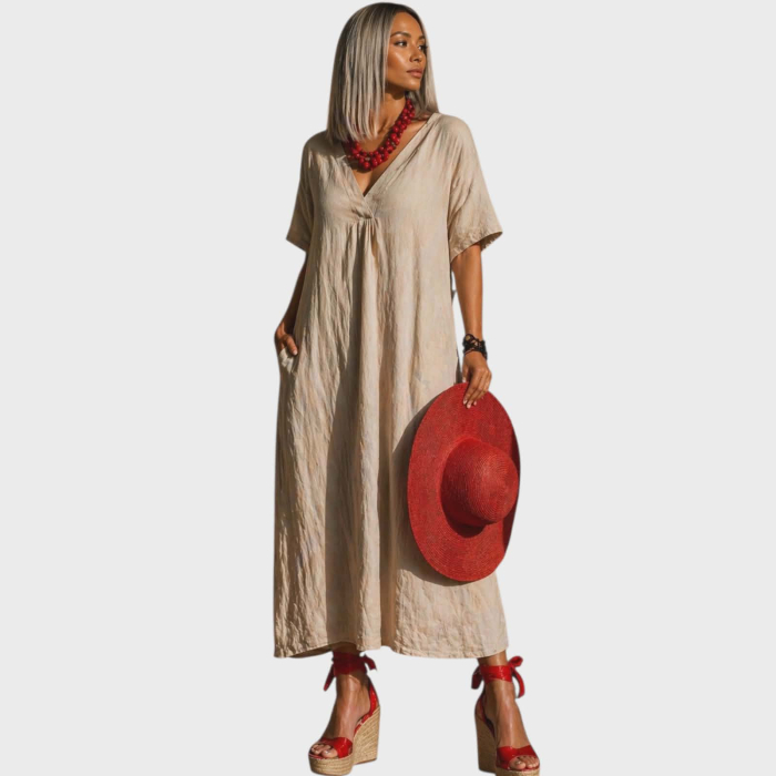 Rochie croi larg din in crem si buzunare laterale ascunse