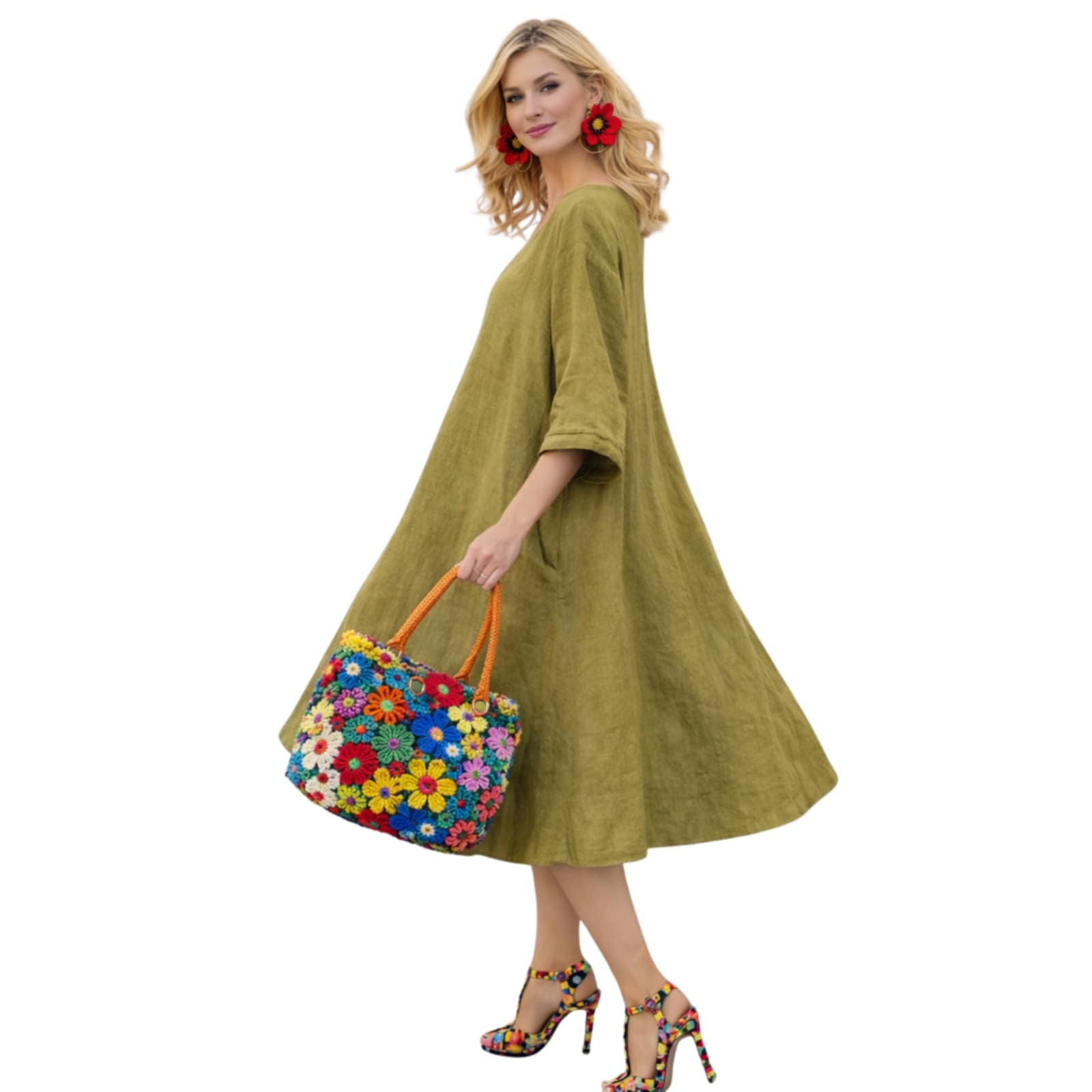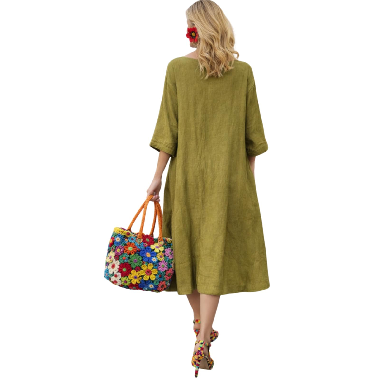 Rochie din in asimetrica croi larg si buzunare laterale