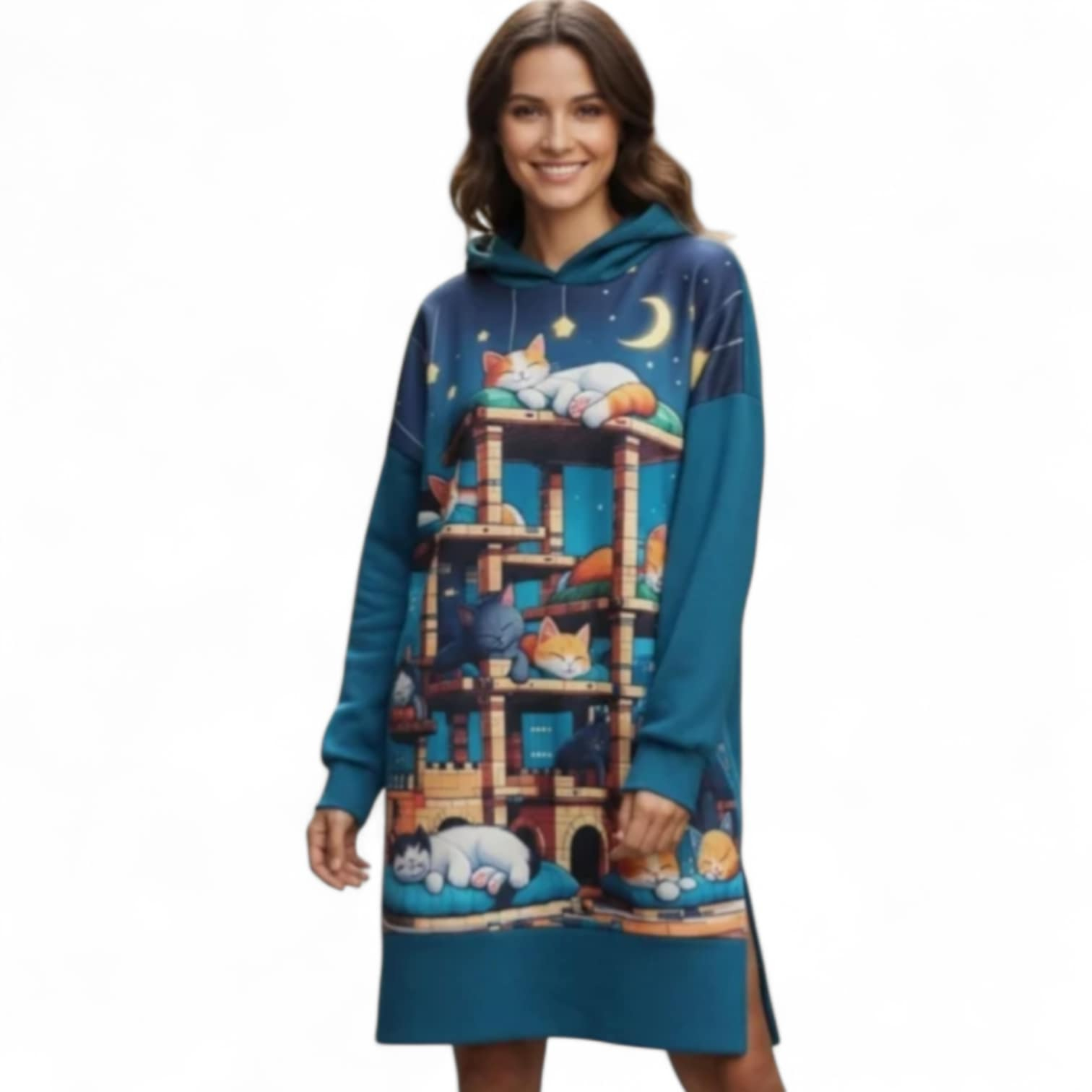Rochie fond albastru pentru colanti tip hanorac cu multe pisici