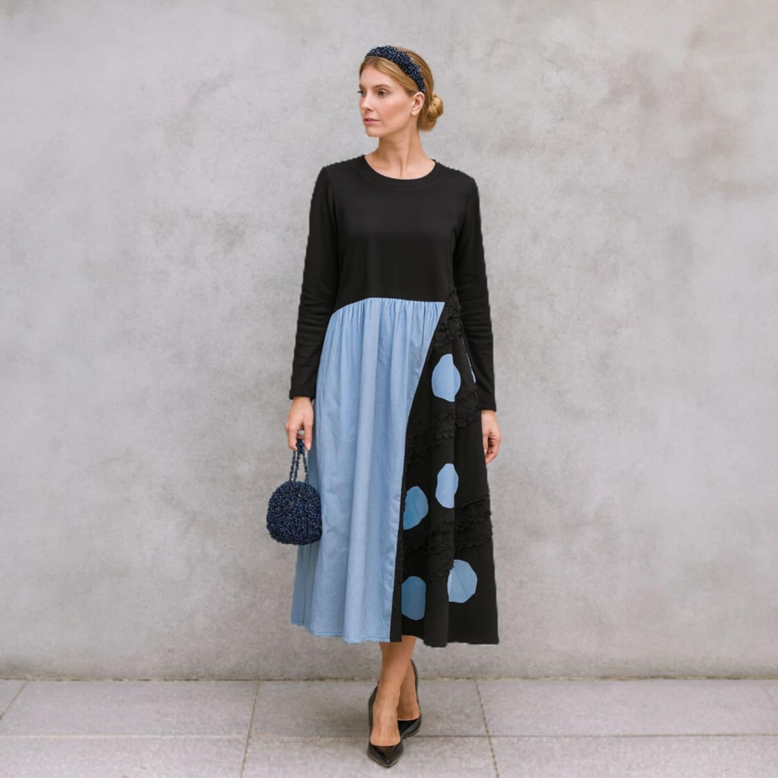 Descopera o rochie midi moderna si confortabila, in nuante de negru si bleumarincu maneci lungi si detalii unice.