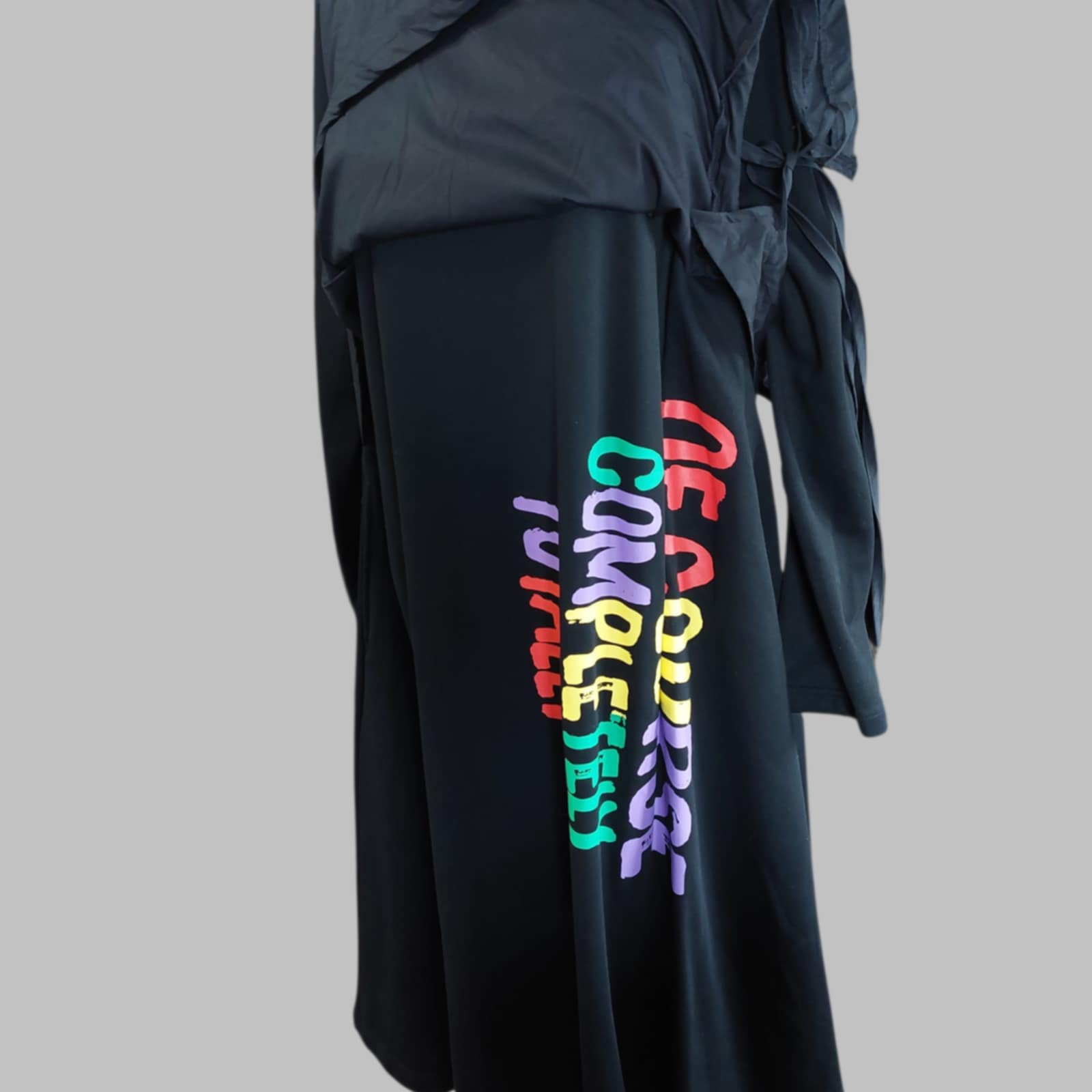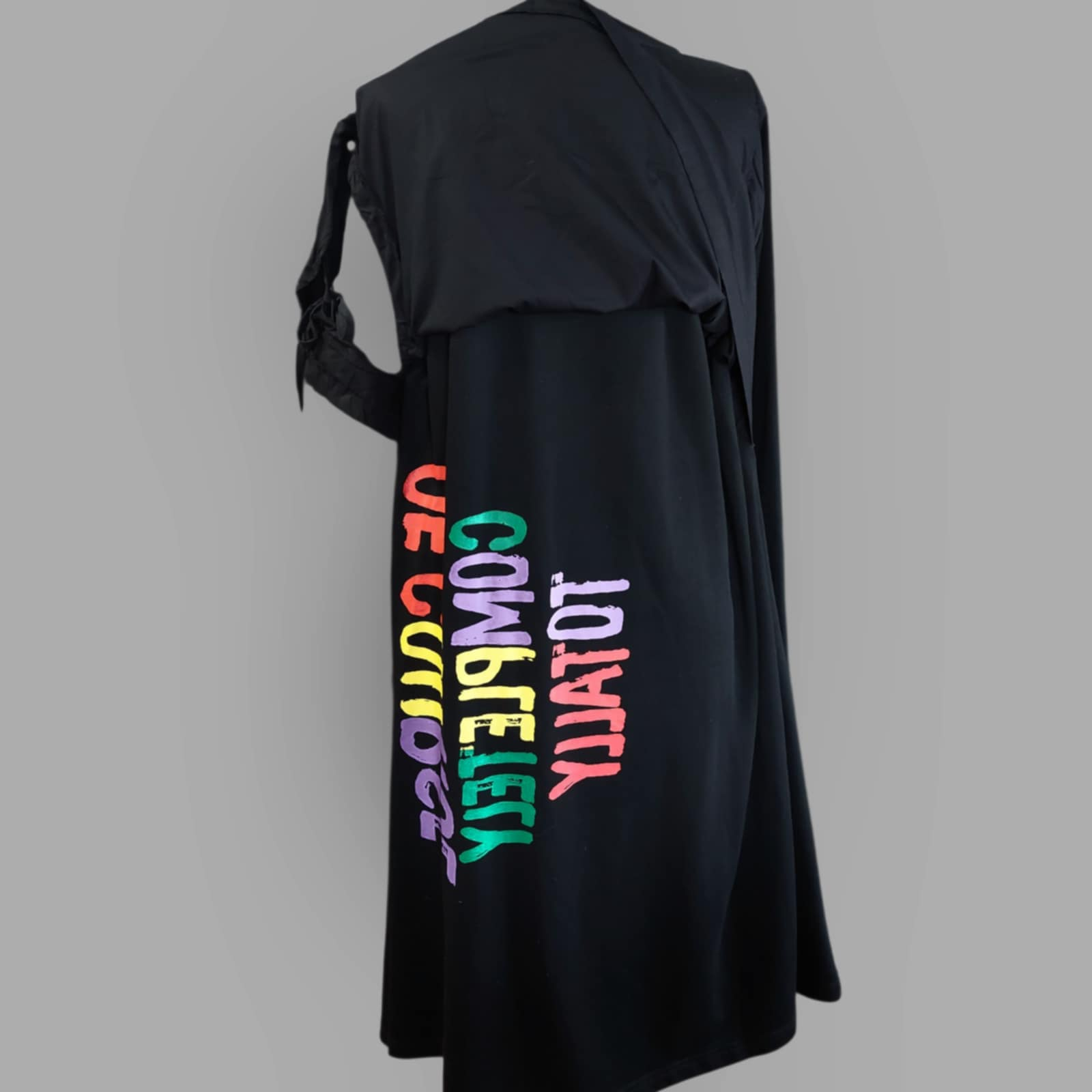 In partea inferioara rochia este decorata cu inscriptii colorate verticale in nuante de rosu, mov, verde si galben