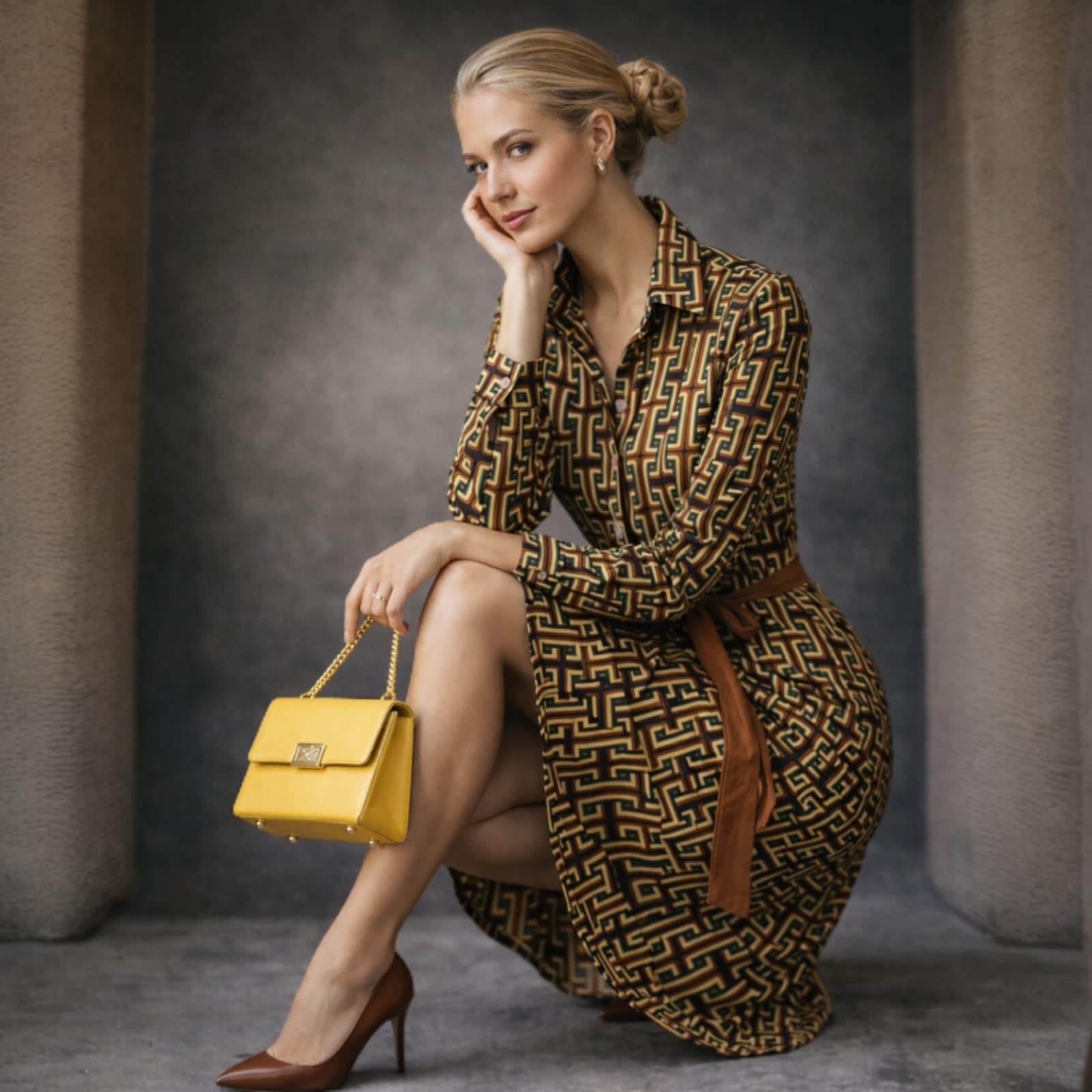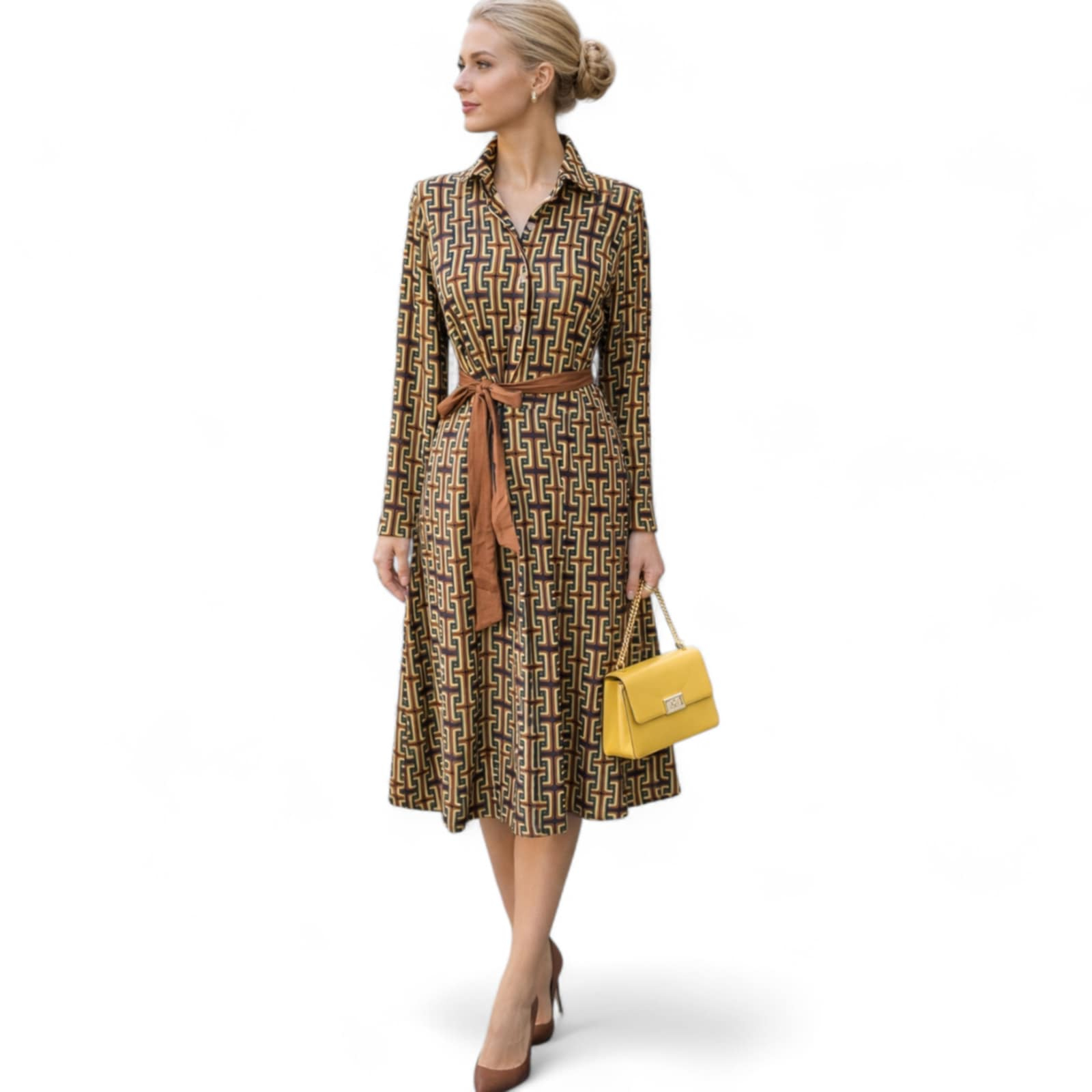 Rochie midi cu imprimeu geometric in nuante de maro si bej este alegerea perfecta pentru un look elegant si feminin.