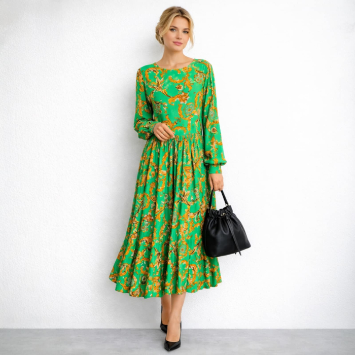 Rochie feminina cu imprimeu baroc in nuante calde de galben-maroniu, pe fundal verde perfecta pentru aparitii elagante sau evenimente casual chic