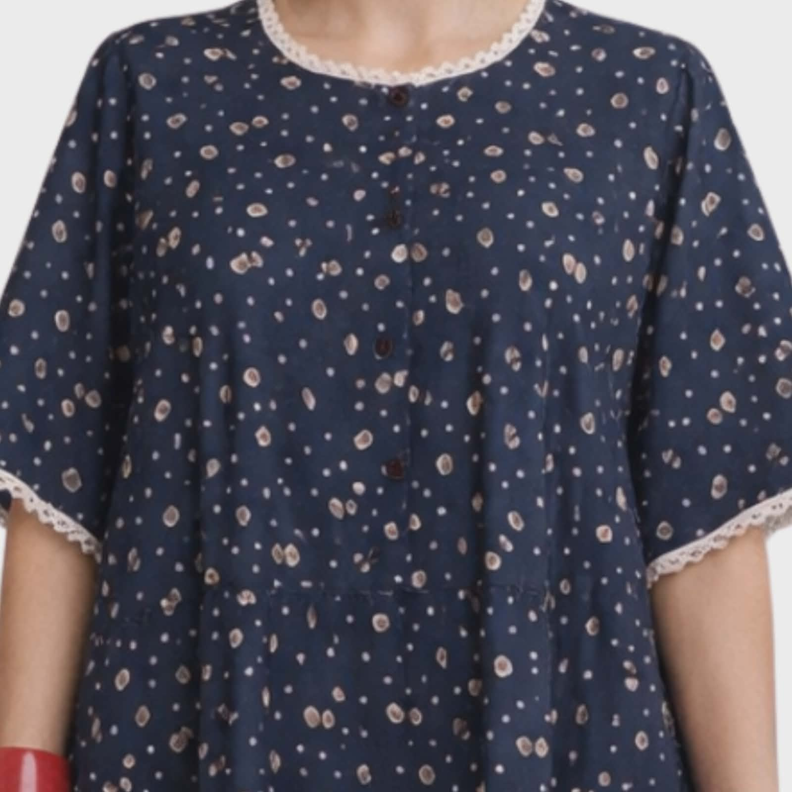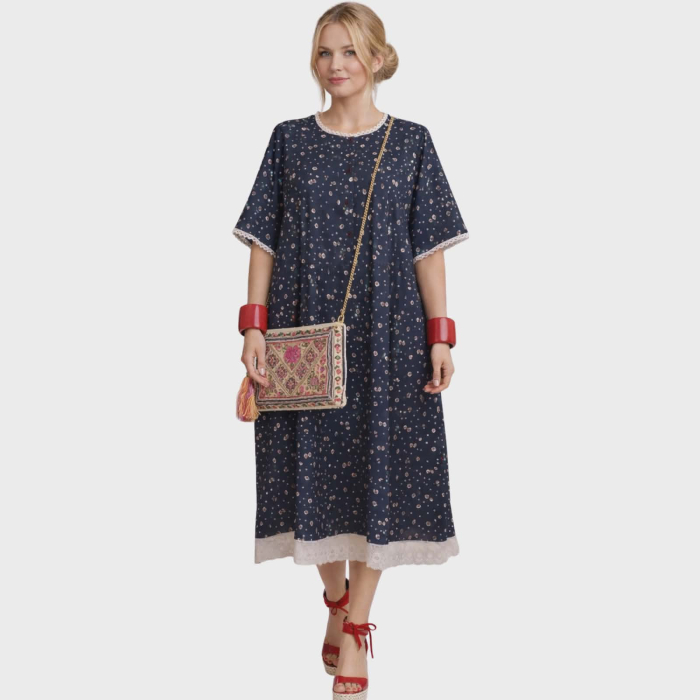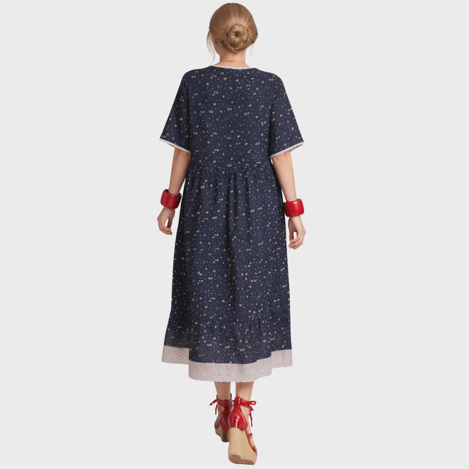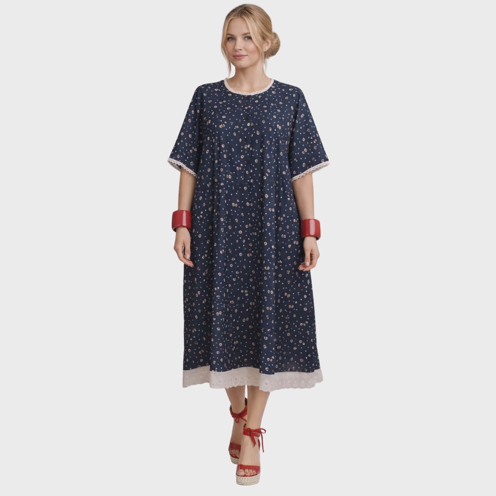 Rochie lejera feminina in nuanta eleganta de bleumarin decorata cu imprimeu discret tip puncte si completata cu detalii fine din dantela la mineci si tiv